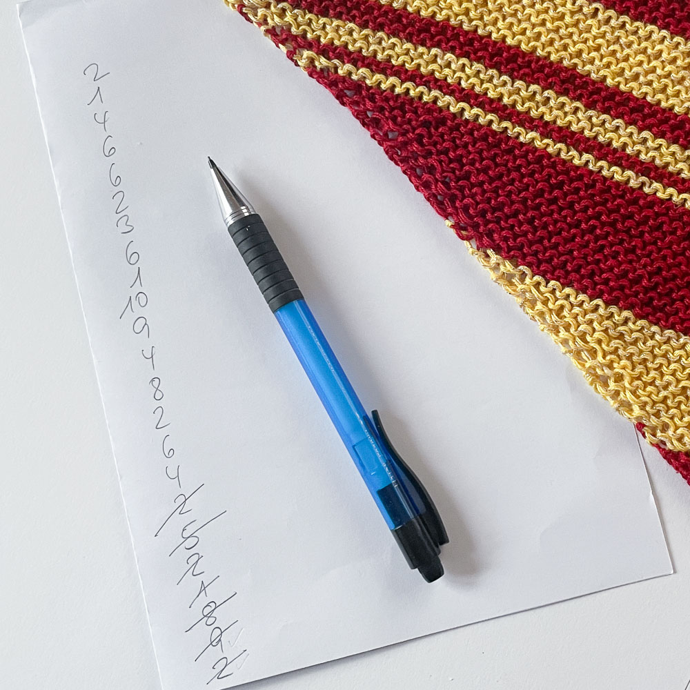 Auf dem Bild links seht Ihr den Zettel. Unten fängt es an mit 298, das ist der 29. August, der Geburtstag meines Mannes. Dann kommt 125, das bin ich (12. Mai) und dann 246, unser Hochzeitstag (24. Juni). Danach geht es weiter mit dem 28. April (unser großer Sohn), 9. Oktober (seine Frau), 16. März (der Enkel), 26. Juni (unser jüngerer Sohn) und 4. Dezember (seine Frau). Danach hätte ich noch Wolle für ein paar wenige Reihen gehabt, die aber keinen Sinn ergeben hätten und deshalb habe ich abgekettet.