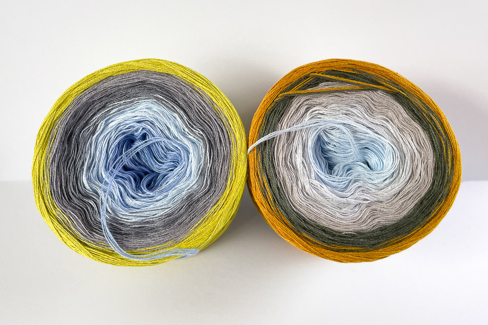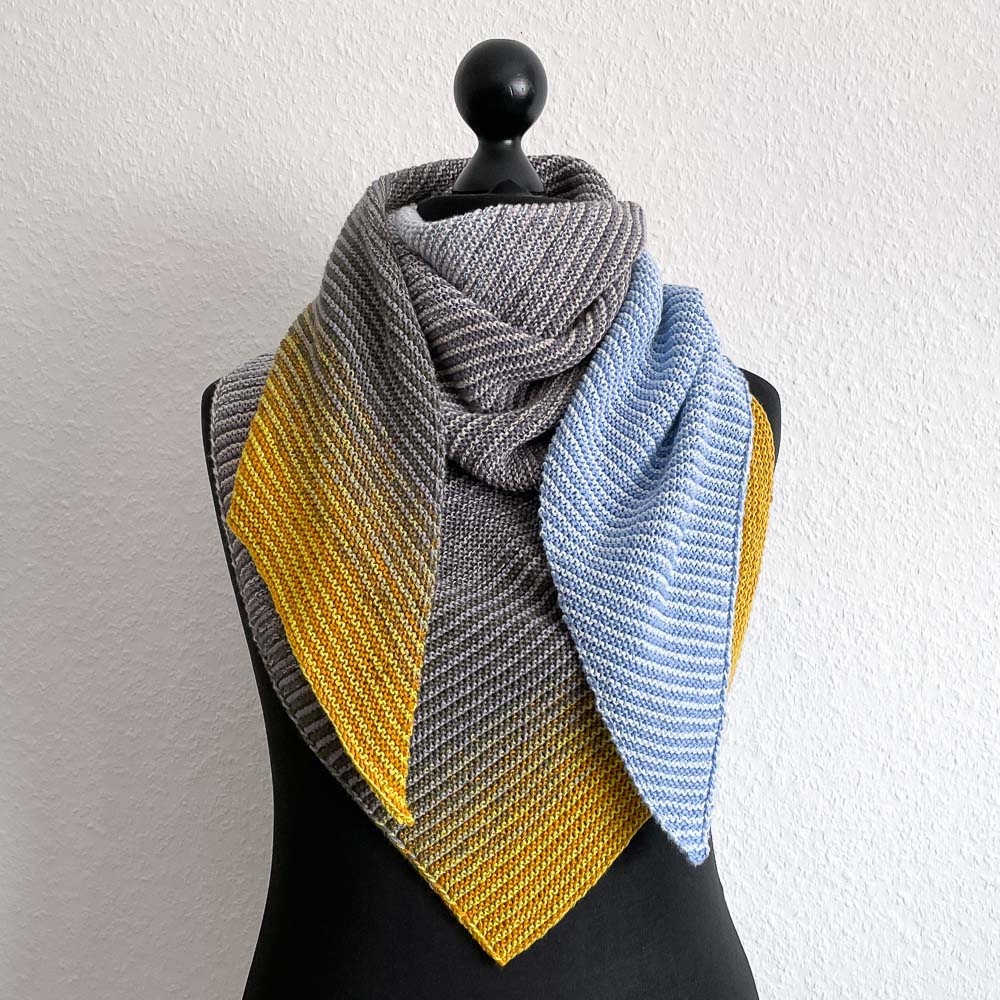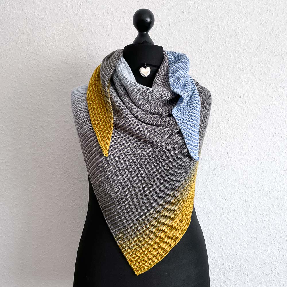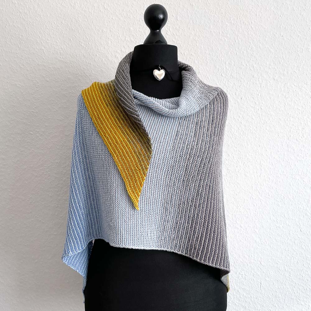 Zum ersten Mal habe ich bei diesem Tuch die Farben für die Wicklung nicht genau nach den Farben des Bildes ausgesucht, sondern danach, wie die Farben zusammen wirken. Man sieht dem Tuch auf etwas Entfernung zum Beispiel nicht an, dass am oberen Rand Limette und Curry verstrickt sind - man nimmt nur das warme Orange war, was die beiden Töne in schmalen 1/1er-Rippen ergeben und das sich auch im Gras unten auf dem Bild findet. Darunter ist Khaki mit Zinn kombiniert, auch da sieht man die einzelnen Farben eher nicht, sondern nur den Gesamteindruck.