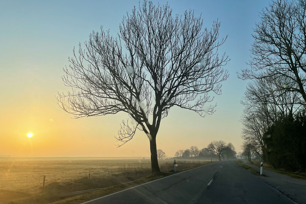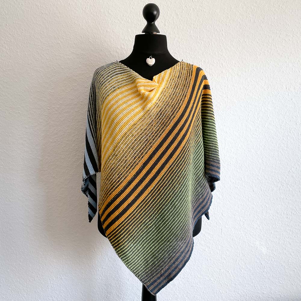 Die Farben des Leuchti beruhen auf dem eingefügten Foto; mehr dazu habe ich Euch hier erzählt. Ich habe lange überlegt, wie ich die Streifen mache, und mich dann entschiede, sie nach den Farben zu machen: Die melierten Bereiche sind alle in 1:1 gestrickt und die uni Bereiche unterschiedlich. Für den Himmel mit den Bäumen habe ich 3:3, für die aufgehende Sonne 2:2, für das noch nicht ganz helle Gras 1:1 und für die Straße mit den noch ein bisschen fahlen Feldrändern 2:2 gewählt. Ich finde, dass das Atmosphäre des Bildes ganz gut einfängt.