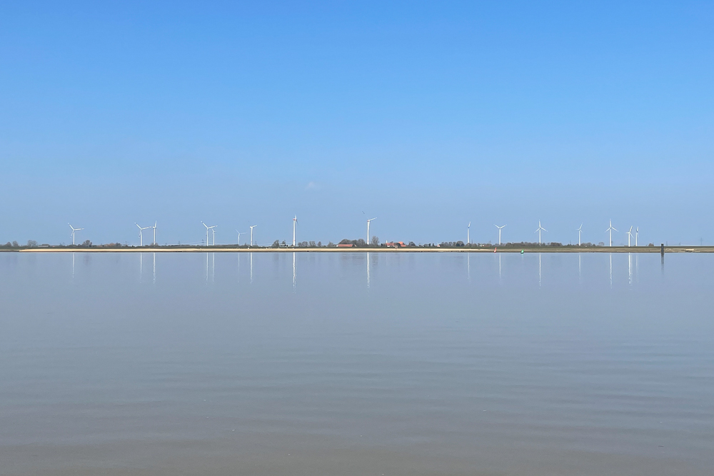 Wir wohnen in Ditzum direkt hinterm Deich an der Ems, aber das wisst Ihr ja schon längst. Wenn wir am Emsufer ein Stückchen flussabwärts gehen, haben wir den Blick auf dem Foto, der bei Windstille ganz besonders beeindruckend ist. Dazu muss man allerdings sagen, dass bei uns Windstille eine Seltenheit ist; so ruhig wie an dem Tag, an dem ich das Foto aufgenommen habe, ist es wirklich fast nie.