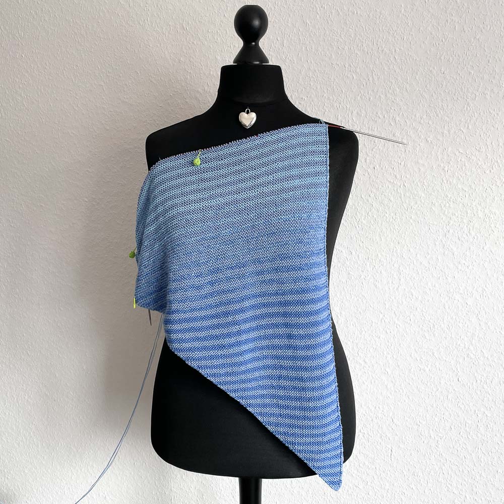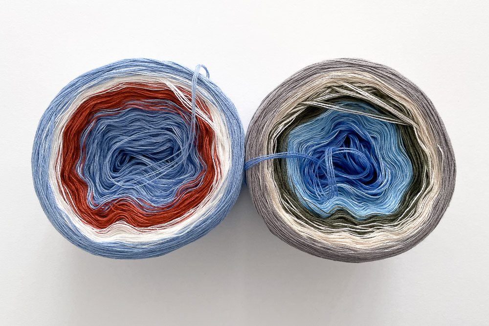 Den Himmel, also die ersten beiden Farbbereiche beider Bobbel, habe ich inzwischen schon gestrickt und mir gefällt der Farbübergang sehr gut. Man sieht, dass Bobbel 1 die Farbe nicht wechselt, sondern nur Bobbel 2; dadurch ist der Himmel ruhiger: