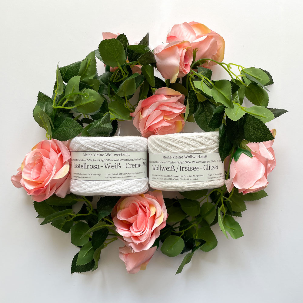 Wichtig war dabei zum einen, dass die Wolle ganz dezent glitzern sollte und zum anderen, dass Leuchti-Wicklungen ja immer mehrfarbig sind. Es galt also, eine Farbkombination zu finden, die ein bisschen glitzerig, dabei aber zurückhaltend und trotzdem romantisch ist. Ich habe wirklich wochenlang darüber nachgedacht und mich dann für diese Farbkombination entschieden:
