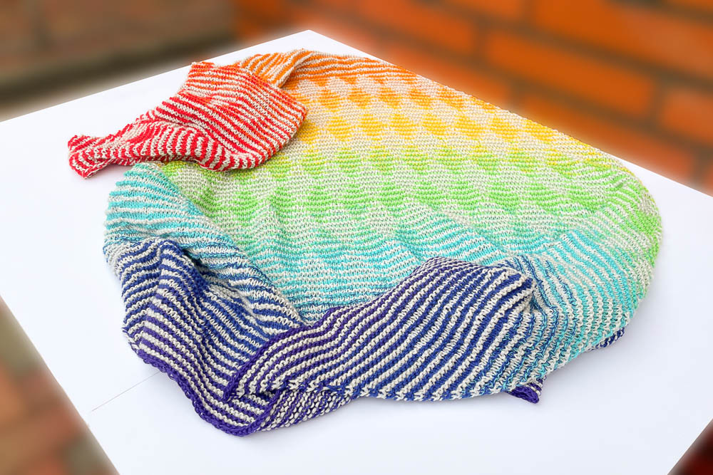 Gestrickt habe ich in Schattenstrickerei-Technik, nach der Anleitung Shadow of Diamonds der Bobbelbox (siehe Edit am Ende des Beitrags). Wie bisher alle Anleitungen der Bobbelbox, die ich gestrickt habe, war die Anleitung klar formuliert, gut erklärt und leicht nachzuarbeiten; es macht viel Spaß, Violas Anleitungen umzusetzen und der Effekt von dieser ist einfach toll.