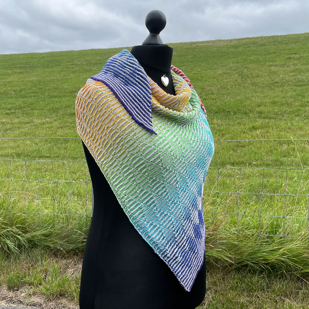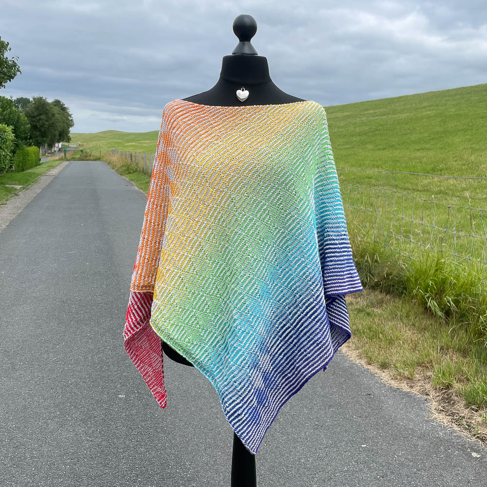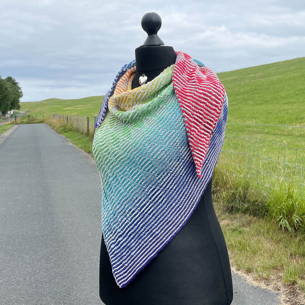In der Leuchtturmtuch-Facebookgruppe gab es eine Aktion, bei der man sich die LGBTQ-Wicklung, die normalerweise Mittelgrau als Uni-Bobbel hat, in einer Uni-Wunschfarbe bestellen konnte. Ich habe mich für Hellgrau entschieden, dem ein ganz dezenter Irisee-Glitzerfaden beigewickelt worden ist; das Irisee-Garn und seine Probleme fotografiert zu werden, kennt Ihr schon von meiner Wolke 7.