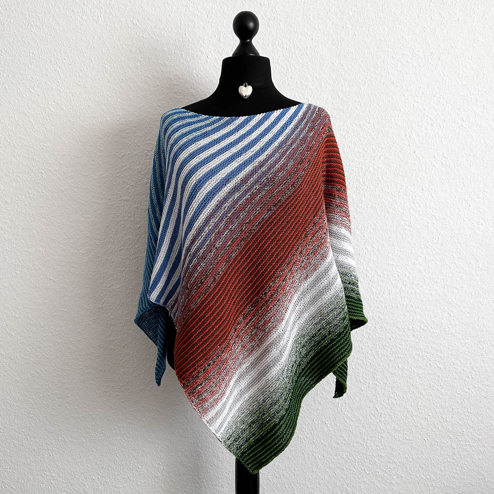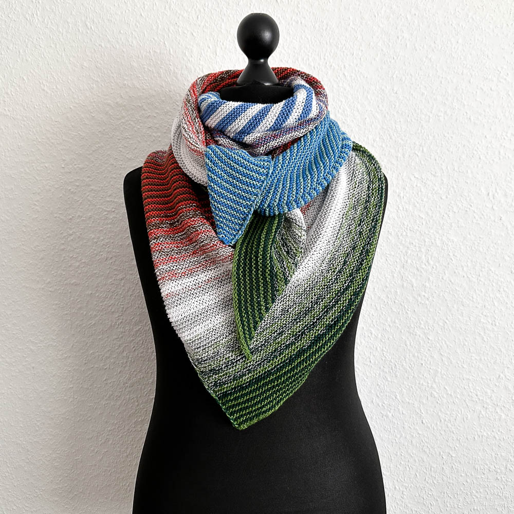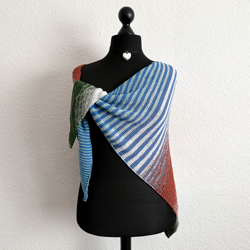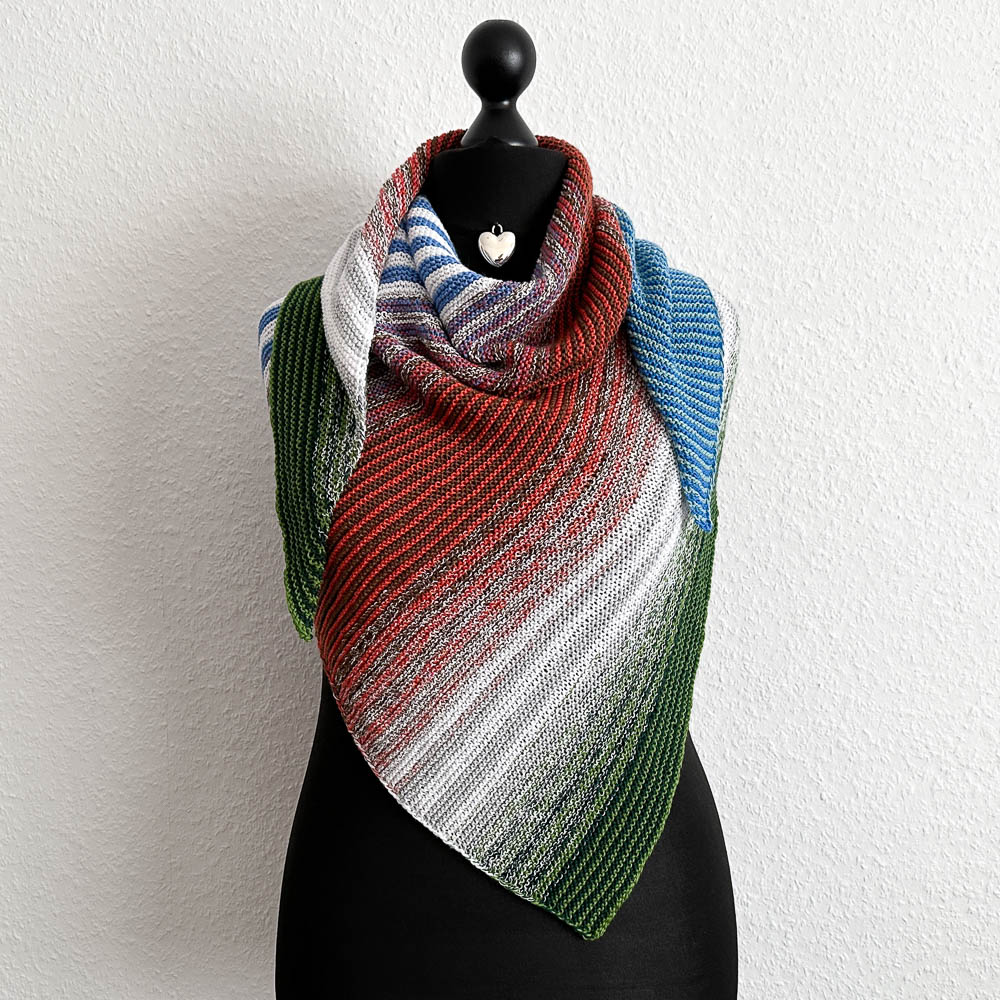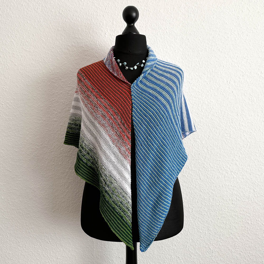 Am Zunahmerand: Hinreihe bis 1 Masche vor Ende stricken, 1 Umschlag, letzte rechts. Rückreihe: 1. Masche rechts, Umschlag verschränkt rechts stricken. - Größe des fertigen Tuches: Ca. 185 cm x 85 cm