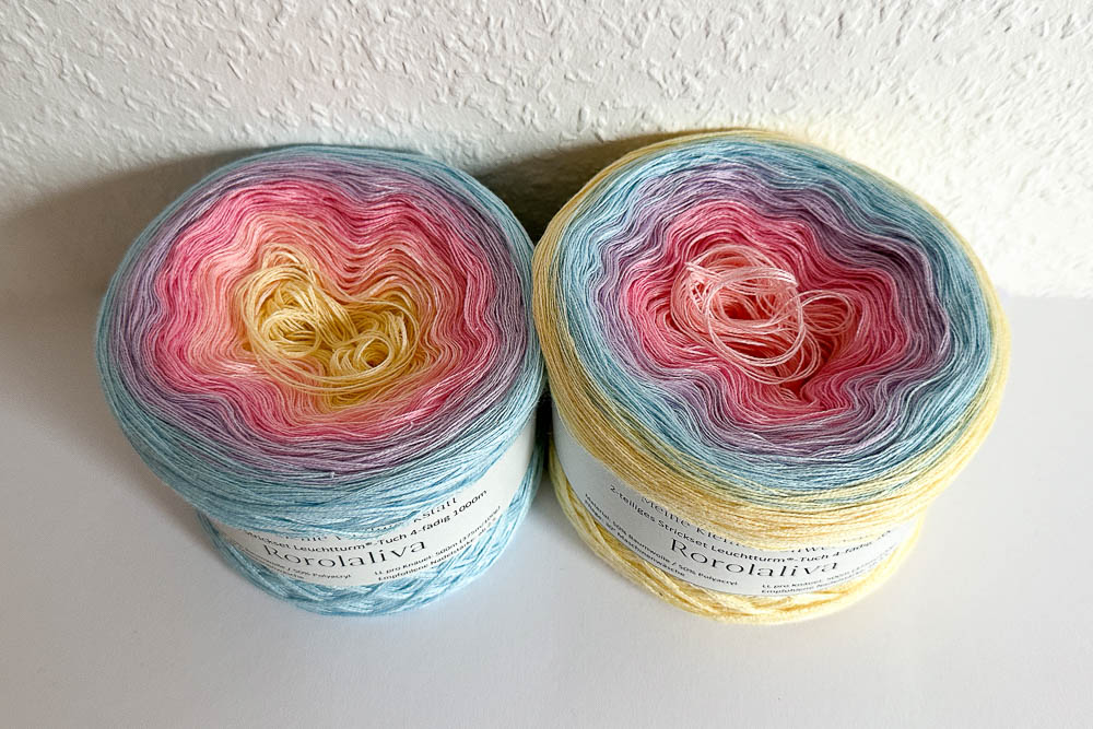 Entstanden ist die Leuchtturm-Wicklung 'Rorolaliva' als Wunschwicklung aus meinem Farbwirbel Mäusespeck. Meiner Freundin Jana gefielen die Farben so gut und sie hat gefragt, ob ich ihr mit denselben Farben wohl auch einen Leuchti stricken könnte.