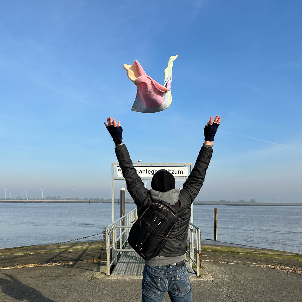 Für die Außenfotos waren wir heute morgen am Ditzumer Außenanleger und mein Bartträger hat das Tuch immer wieder in die Luft geworfen, während ich fast 90 Fotos gemacht habe. Bei uns ist die Natur einfach eine wunderbare Kulisse und ich finde, dass die sanften Farben vor dem wunderbar blauen Himmel besonders gut zur Geltung kommen.