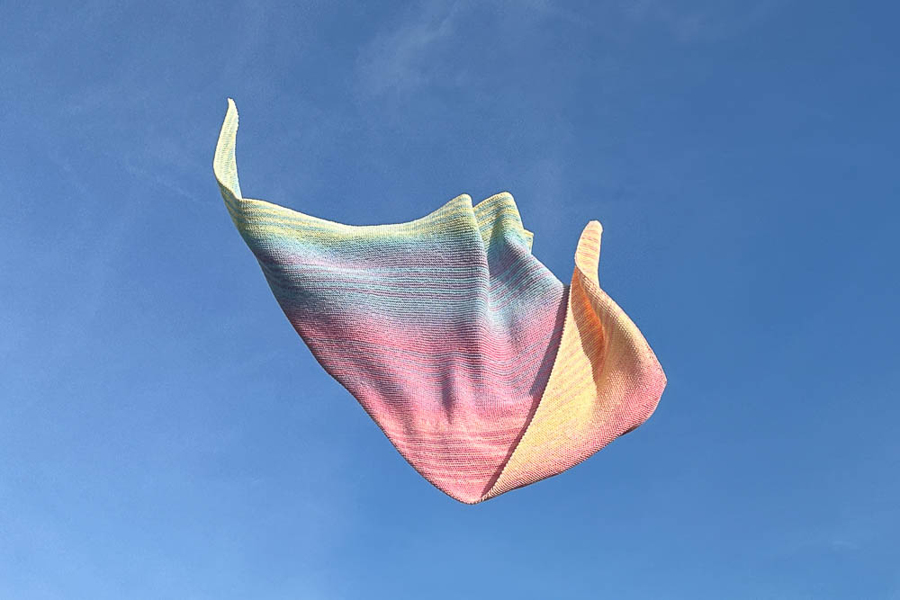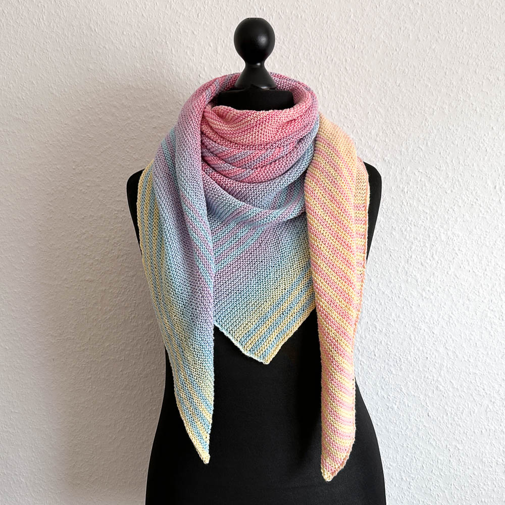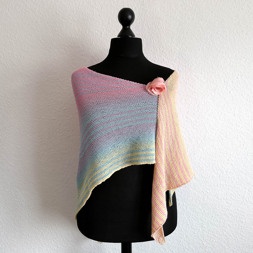 Am Zunahmerand: Hinreihe bis 1 Masche vor Ende stricken, 1 Umschlag, letzte rechts. Rückreihe: 1. Masche rechts, Umschlag verschränkt rechts stricken. - Größe des fertigen Tuches: Ca. 185cm x 85cm