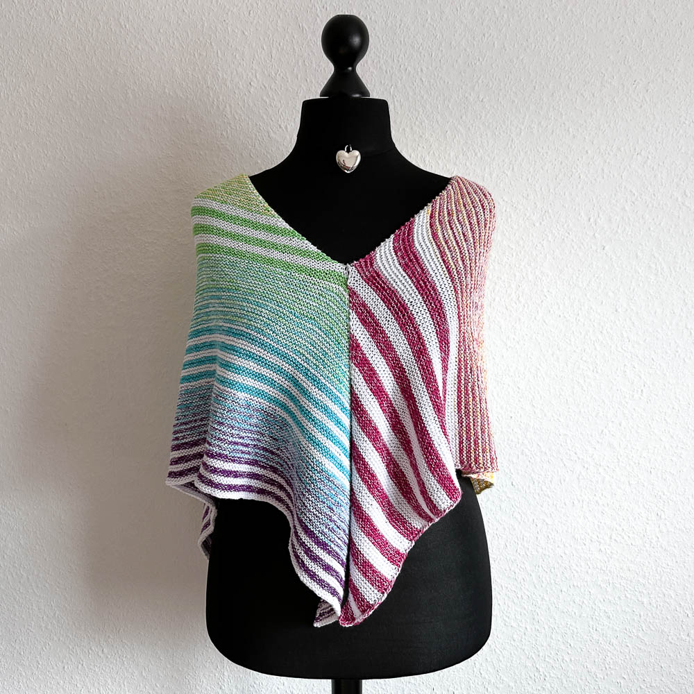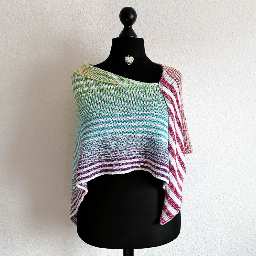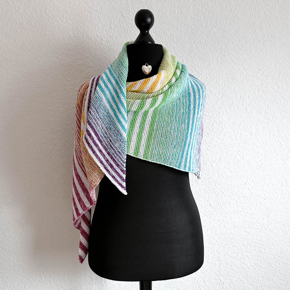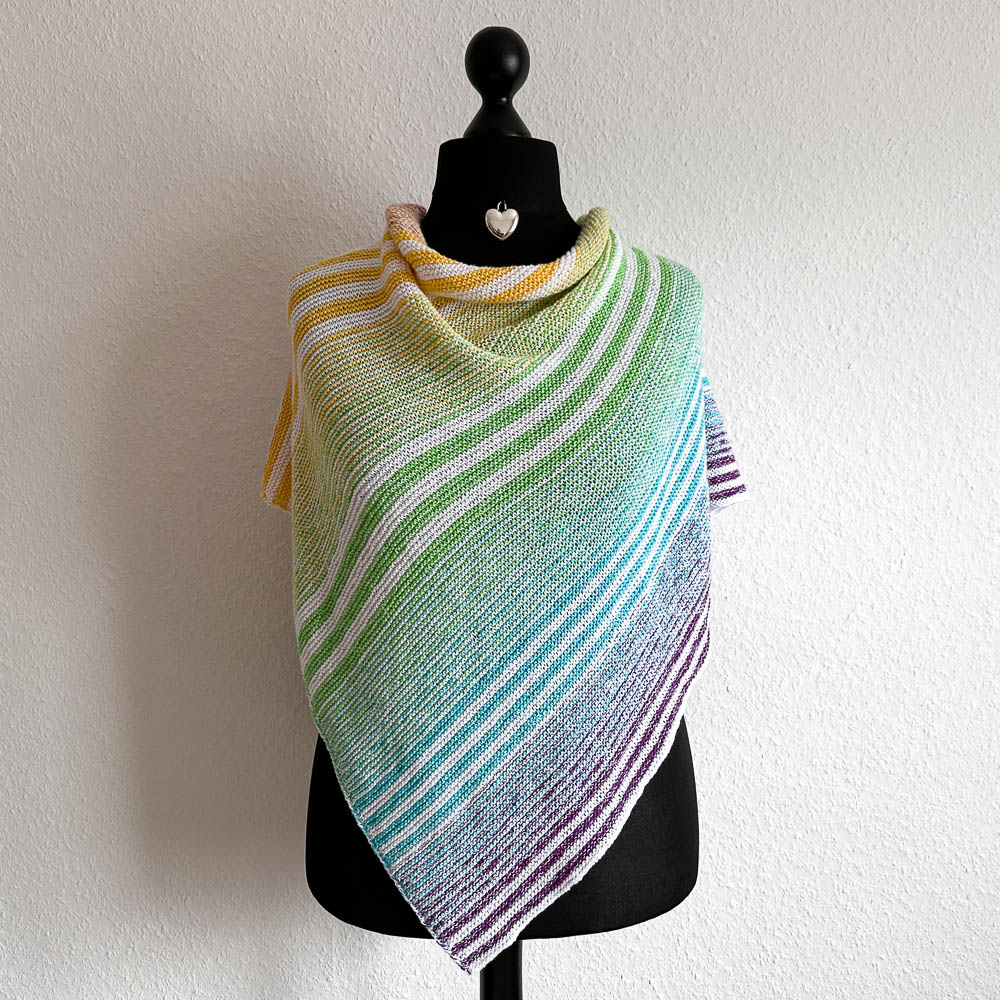 Am Zunahmerand: Hinreihe bis 1 Masche vor Ende stricken, 1 Umschlag, letzte rechts. Rückreihe: 1. Masche rechts, Umschlag verschränkt rechts stricken. - Größe des fertigen Tuches: Ca. 185cm x 85cm