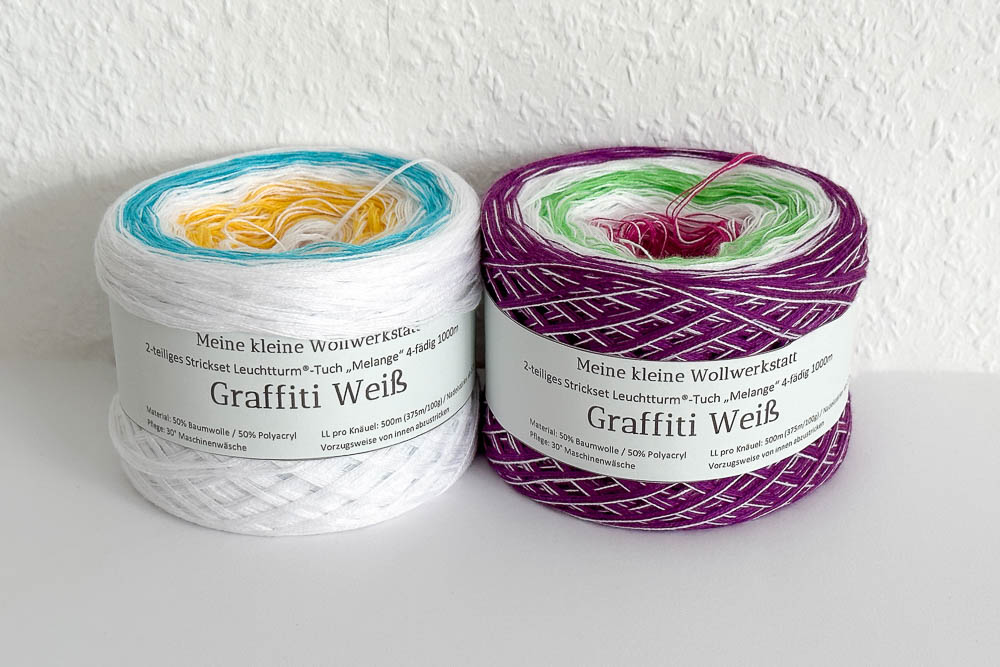 Im Juli letzten Jahres hatte ich mir bei der Kleinen Wollwerkstatt die Graffiti Weiß-Wicklung bestellt. Ich mochte die Farben und vor allem die Tatsache, dass die farbigen Abschnitte komplett meliert sind; es gibt keine unifarbenen Farbabschnitte. Ich mag bei Leuchtis die melierten Bereiche sehr gerne und fand die Vorstellung, dass das Melierte sozusagen 'durch' geht, einfach klasse.