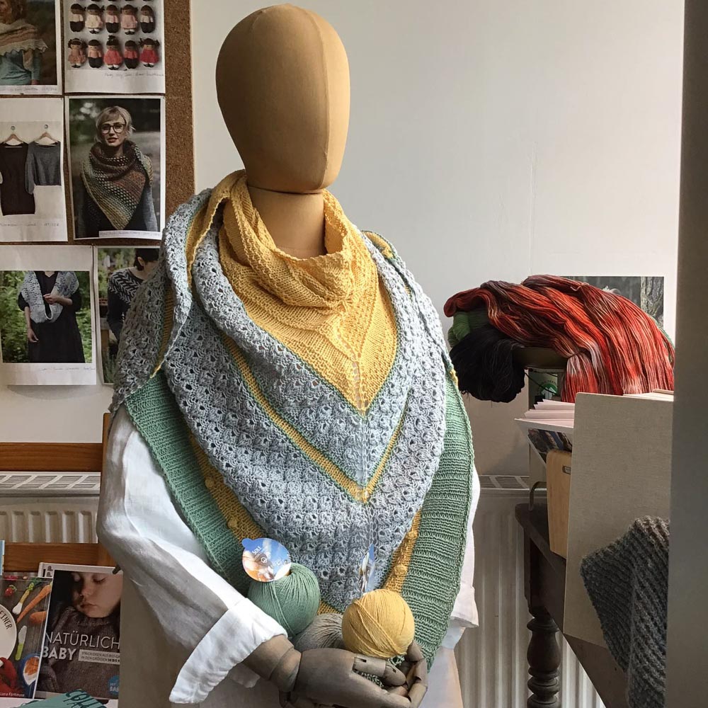 Mit der Wolle fängt dann auch die besondere Geschichte des Tuches an. Ich habe die Wolle bei KarinE. gekauft; sie hat in Erftstadt ein tolles Wollgeschäft namens One Stitch Beyond, in dem man auch online bestellen kann. Sie kannte meine gestrickten Tücher und hatte mich gefragt, ob ich eines meiner Tücher mal für ein paar Wochen ihrer Schaufensterpuppe zur Verfügung stellen würde, was ich natürlich eine tolle Idee fand. Logischerweise sollte das Tuch dann auch aus Wolle sein, die man bei Karin kaufen kann.
