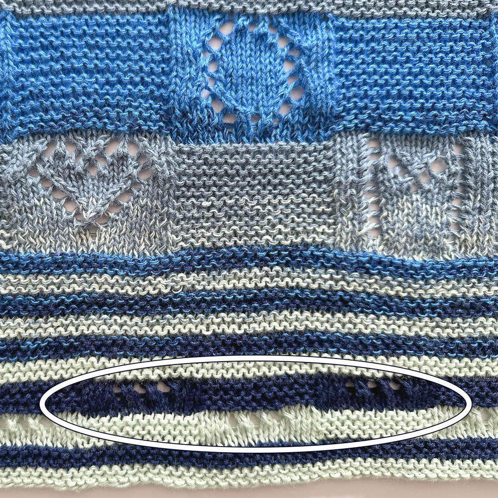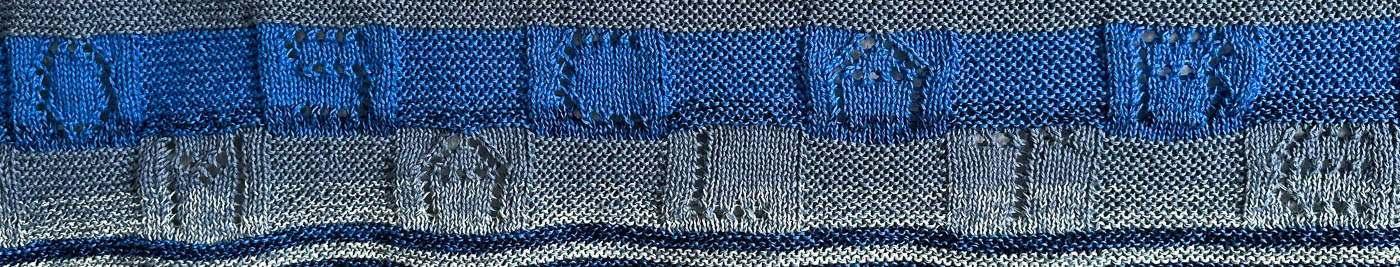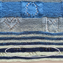 Nach den Namen habe ich, da die Wolle für einen weiteren Durchgang Geburtstagsstreifen nicht gereicht hätte, in Zweierrippen weiter gestrickt, weil es zwei Enkel sind. Und kurz vor Schluss habe ich noch zwei drei Rippen breite Streifen eingestrickt mit Lochmuster in Dreiergruppen, was 'Pünktchen, Pünktchen, Pünktchen' bedeuten soll, also soviel wie 'Fortsetzung folgt':