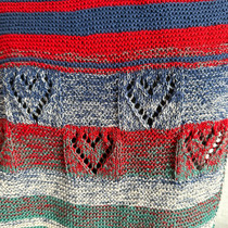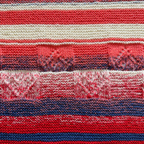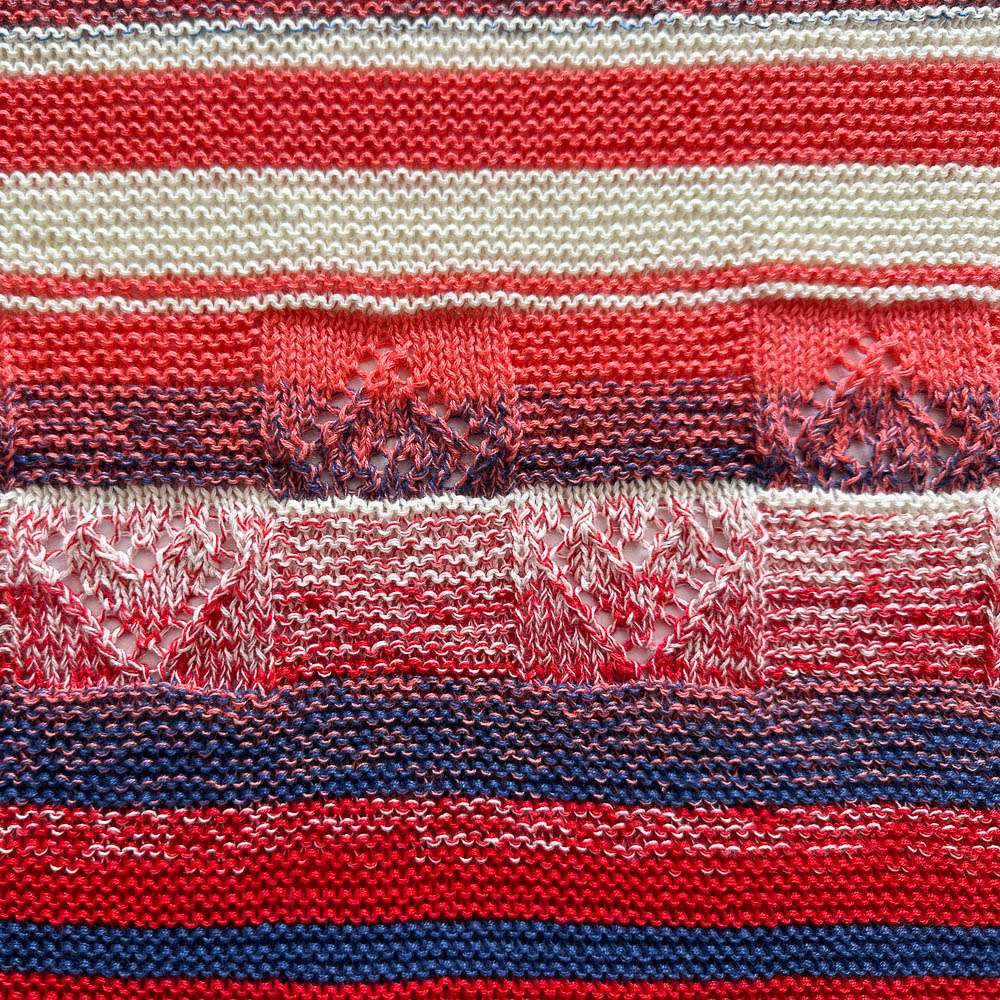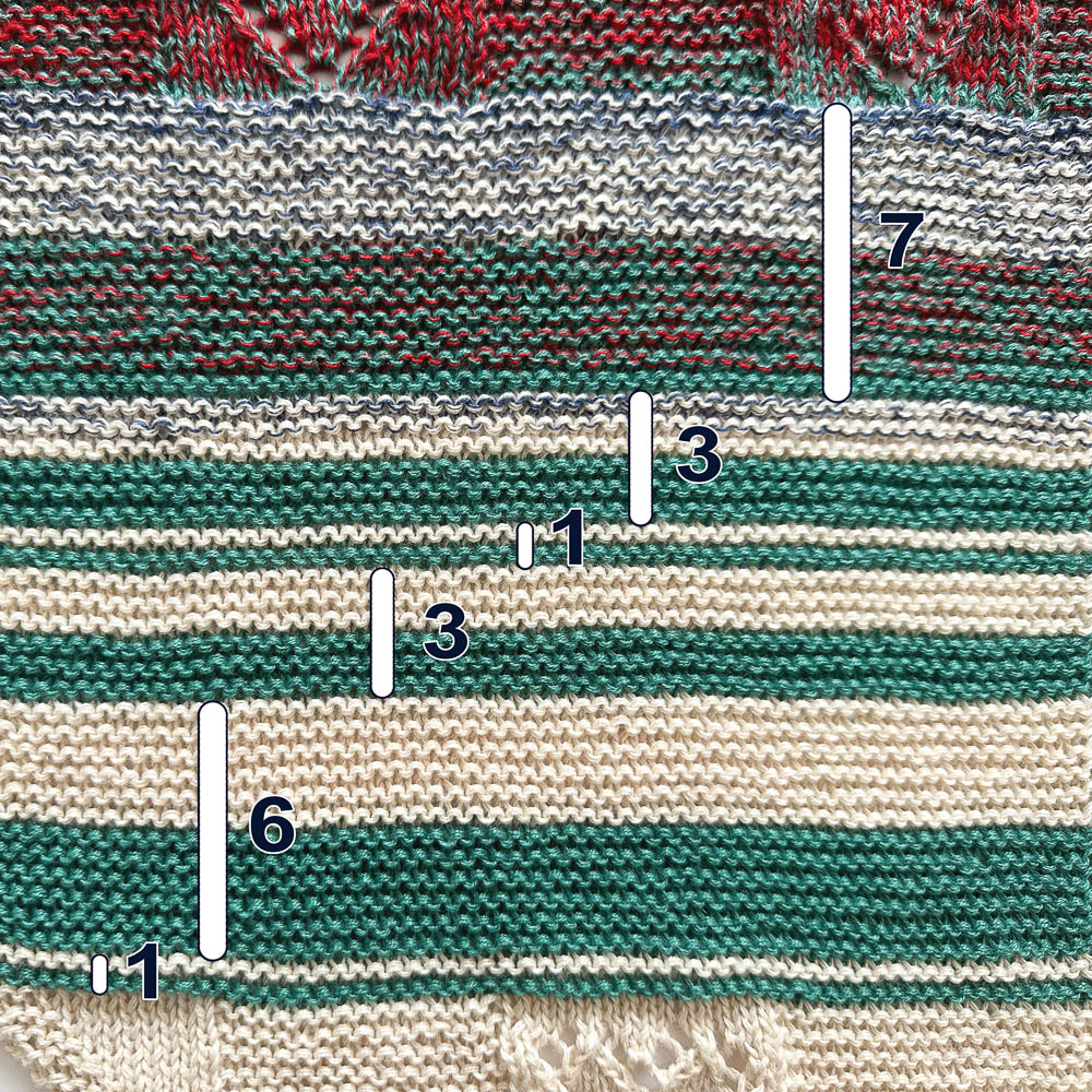 Als Streifenfolge habe ich mich für 1 - 6 - 3 - 1 - 3 - 7 entschieden, jeweils mit beiden Farben. Das sind die Geburtstage der Enkel, der 16. März und der 13. Juli. Die Streifenfolge habe ich viermal gestrickt. Hinter dem ersten und dem zweiten Durchgang kommen jeweils zwei je zehn Rippen breite Herzmuster, nach dem dritten Durchgang auch, wobei das zweite Herzmuster auf dem Kopf steht (weil dieses und alle weiteren Muster sonst beim Tragen des Tuches auf dem Kopf stehen würden):