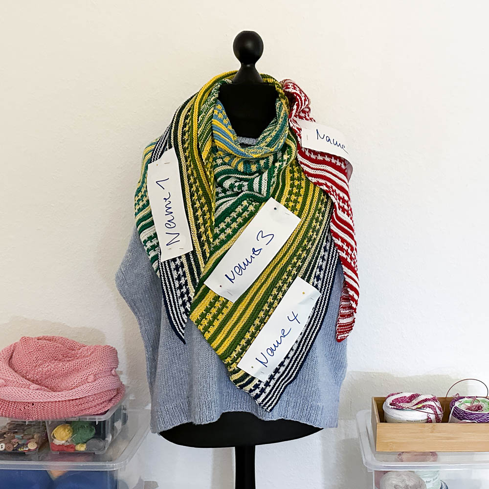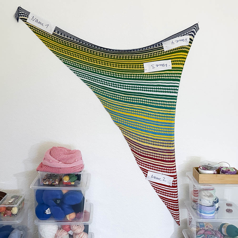 Eingestrickt habe ich nicht nur die Namen als Farben, sondern noch viel mehr; unter den Bildern erzähle ich Euch das im Einzelnen.