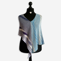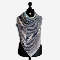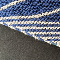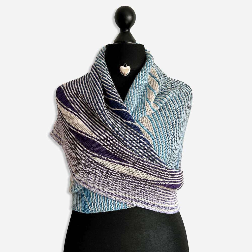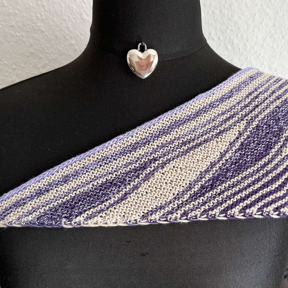 Zuerst ist mir das Besondere an dem Tuch gar nicht aufgefallen, nämlich die schräg laufenden Tropfenketten im geraden Gestrick; diesen Effekt erreicht man durch verkürzte Reihen, die Kirsten in einem separaten Video genau erklärt. Nachdem ich diese schrägen Streifen allerdings entdeckt hatte, wollte ich das Tuch unbedingt stricken. Das kann man mit jeder beliebigen Wolle; man benötigt zwei kontrastierende Farben. Den Garnverbrauch gibt Kirsten für vierfach gefachte Wolle mit ca. 700m pro Farbe an, in der Anleitung finden sich aber aber auch Angaben für andere Wollarten.