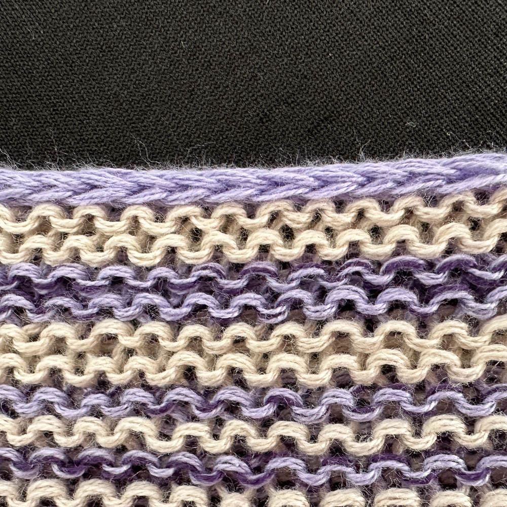 Nach den drei breiteren Abschlussstreifen (in der letzten Reihe hat ungefähr 30 Maschen vor Reihenende die Farbe tatsächlich zu Uni-Krokus gewechselt) habe ich noch eine Hinreihe in Krokus gestrickt und dann in der Rückreihe per iCord abgekettet. Natürlich hatte ich ziemlich viel Krokus übrig, nämlich knappe 22g.
