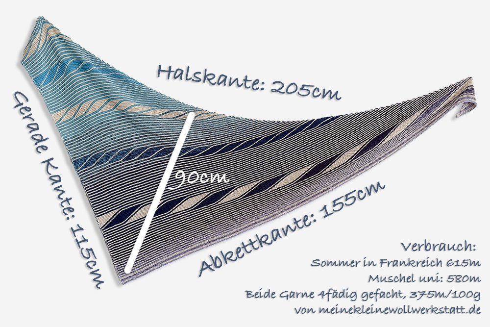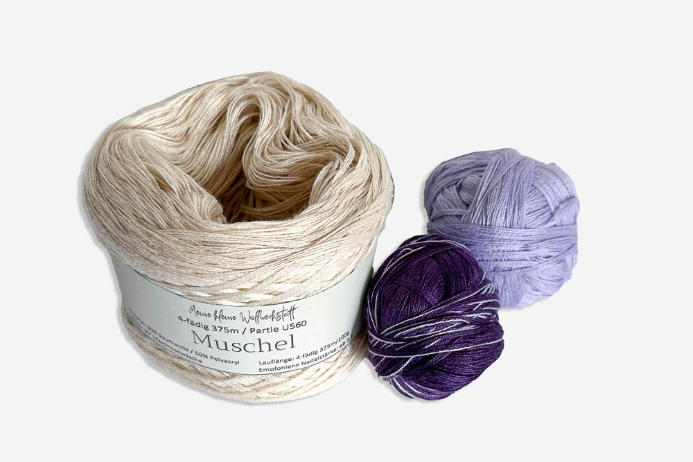 In meinem Fundus hatte ich noch einen 750m-4fach-Bobbel Sommer in Frankreich von Meine kleine Wollwerkstatt; kombiniert habe ich diesen mit 750m Uni-Muschel, auch von der Kleinen Wollwerkstatt. Da ich vergessen hatte, den 'Sommer in Frankreich'-Bobbel vor dem Losstricken zu fotografieren, hat Maike von 'Meine kleine Wollwerkstatt' mir eines ihrer Fotos zur Verfügung gestellt - vielen lieben Dank dafür.