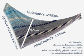 Gestrickt habe ich mit 3,25-Nadeln; die Maße des Tuches und den Wollverbrauch findet Ihr auf dem Übersichtsbild oben.