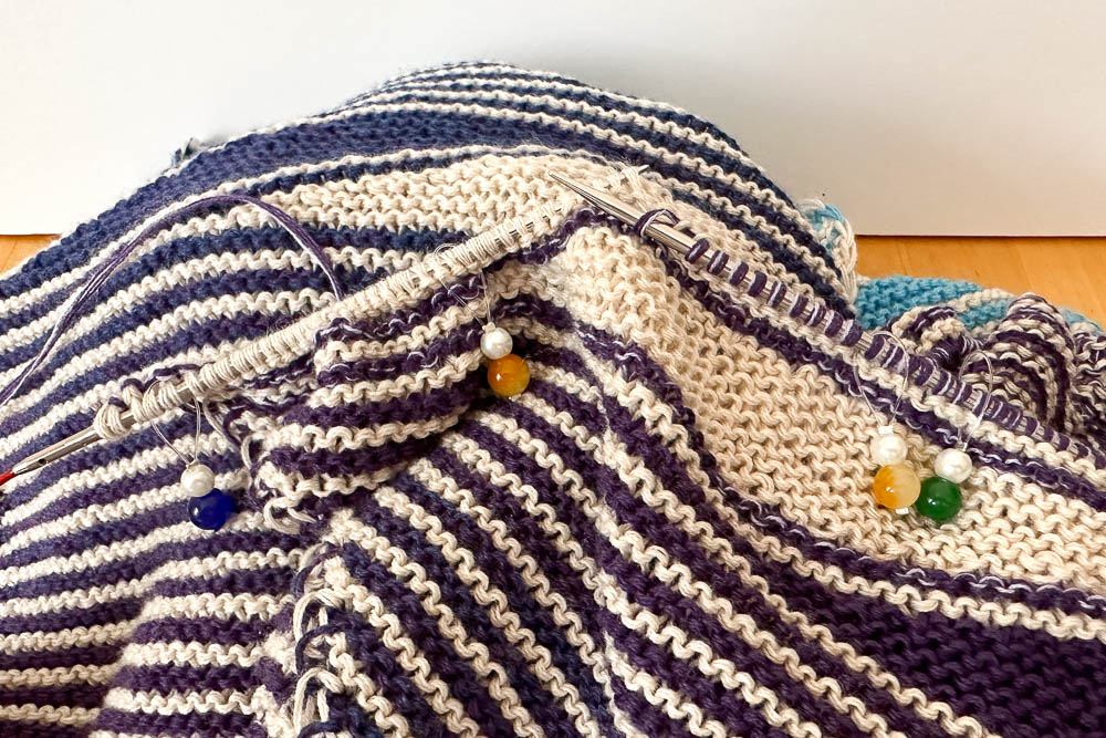 Noch ein kleiner Tipp zum Schluss: Ich bin ein Zählfreak, ich zähle wirklich jede Reihe immer mit, damit auch alles stimmt. Damit das nicht so kompliziert ist, habe ich alle 50 Maschen einen Maschenmarkierer eingesetzt, bei den 50, 150 und 250 je einen grünen, bei 100, 200 und 300 je einen blauen. Dazu habe ich, wie Kirsten in ihren Videos zur Anleitung erklärt, die Tropfen markiert, dazu habe ich orangefarbene Markierer verwendet.