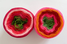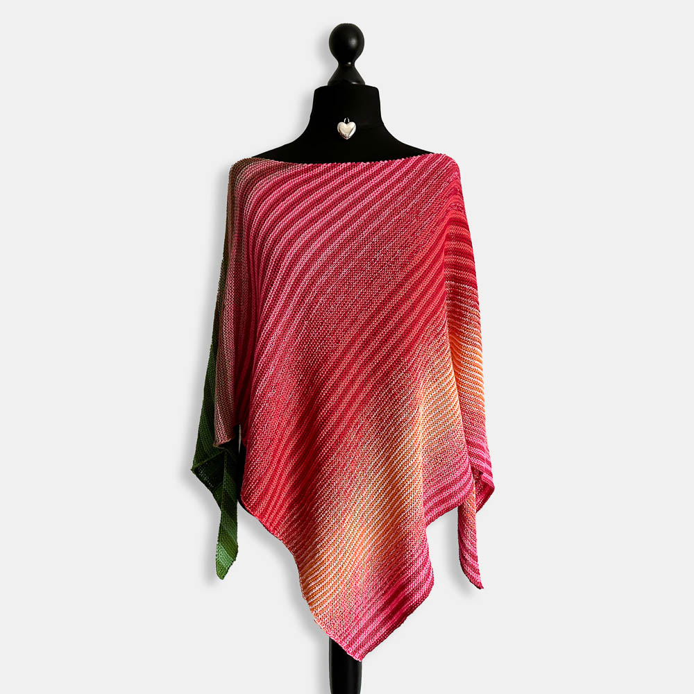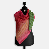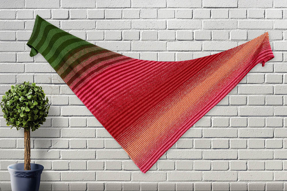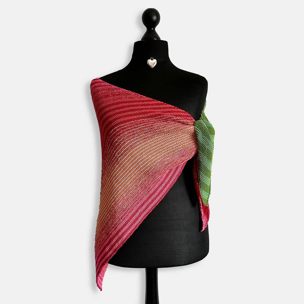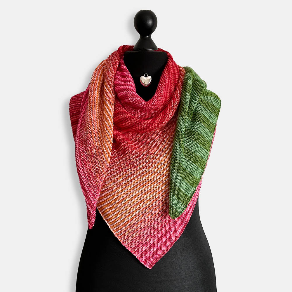 Mir gefällt das Tuch unglaublich gut und es ist genau so geworden, wie ich es mir vorgestellt hatte: Der grüne Zipfel liegt (bei meiner Art, ein Tuch zu tragen) wie ein Blatt über den Blütenfarben; genau diesen Effekt wollte ich gerne haben.