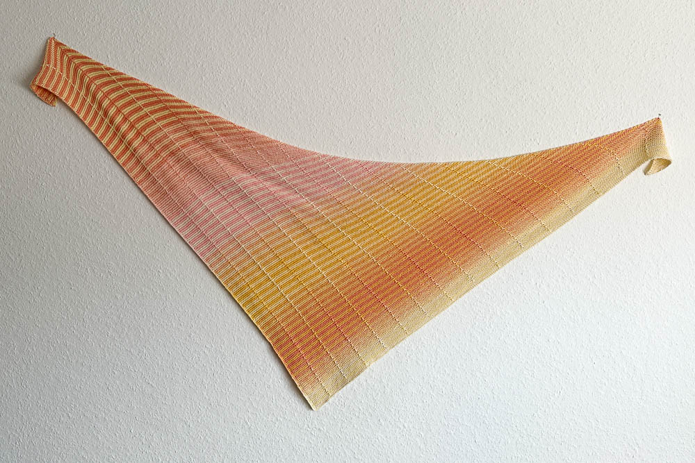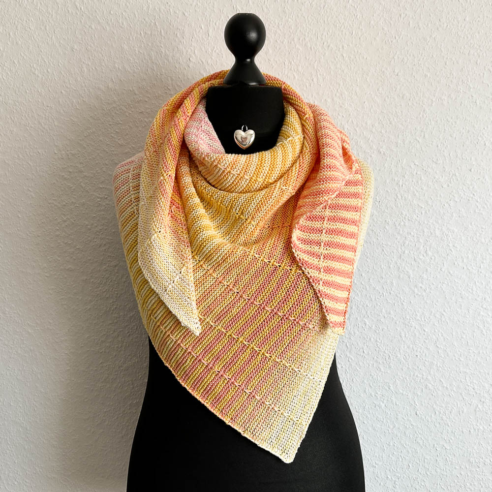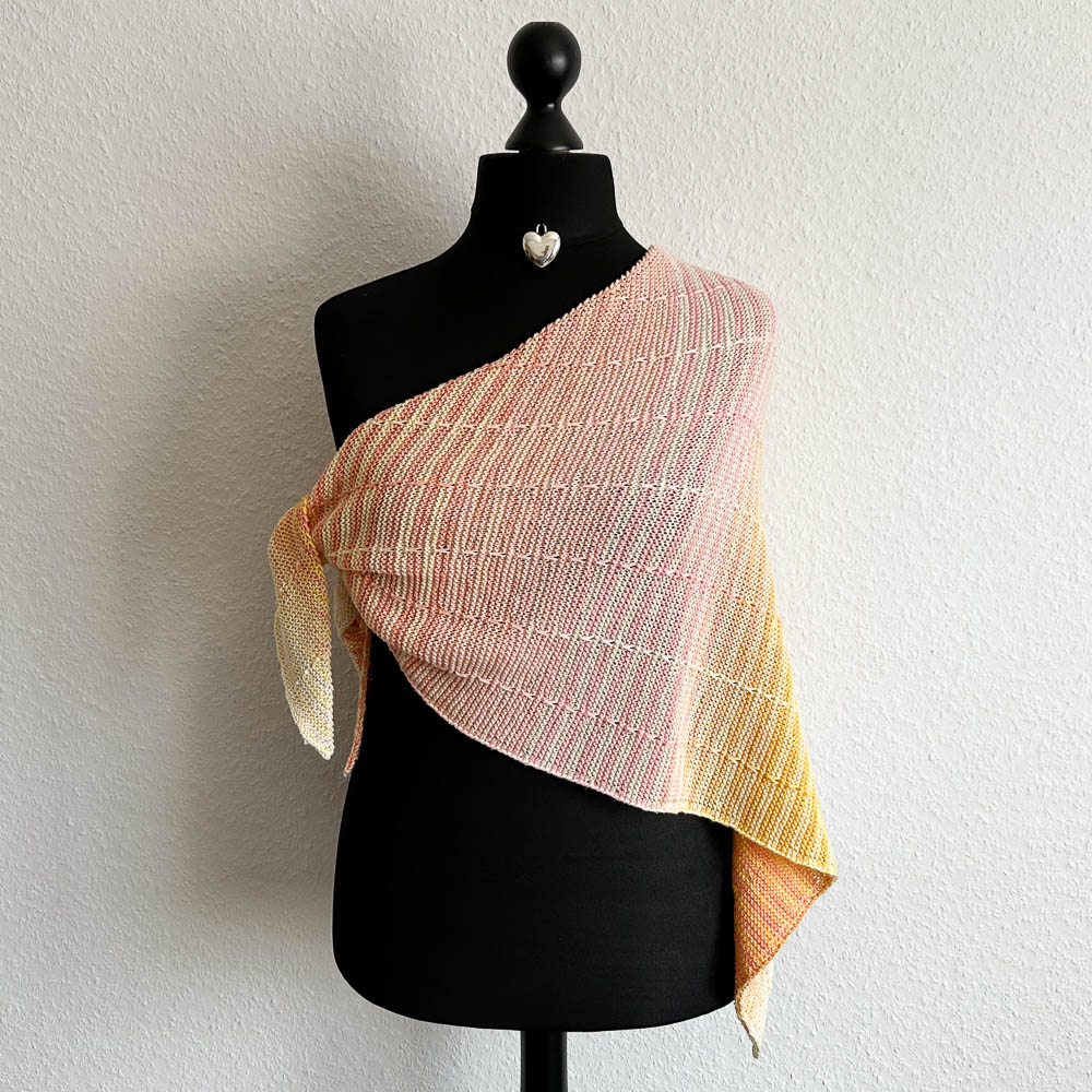 Am Zunahmerand: Hinreihe bis 1 Masche vor Ende stricken, 1 Umschlag, letzte rechts. Rückreihe: 1. Masche rechts, Umschlag verschränkt rechts stricken. - Größe des fertigen Tuches: Ca. 185cm x 85cm