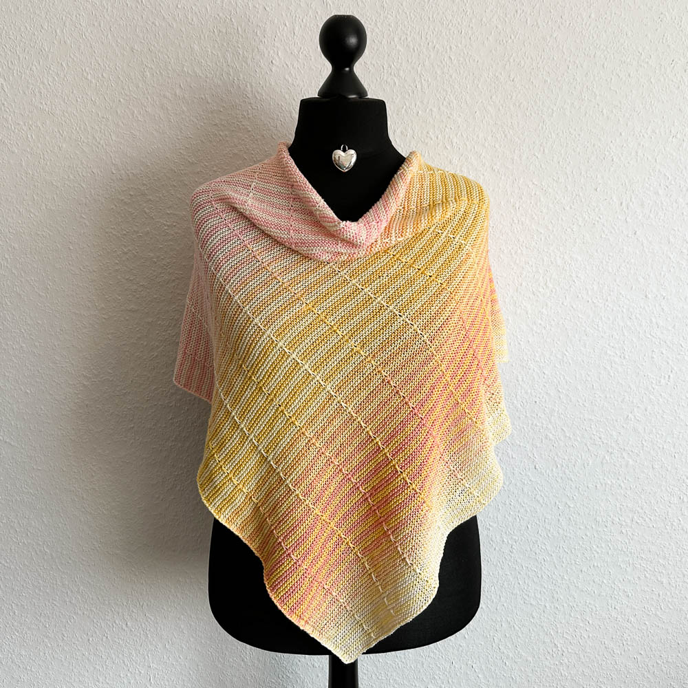 Ich habe das Tuch in ruhigen 2/2er-Rippen gestrickt, die ich nur mit senkrechten Hebemaschenlinien ein bisschen aufgelockert habe; der Abstand zwischen den Linien beträgt 14 Maschen. Im Nachhinein habe ich festgestellt, dass 15 Maschen Abstand sinniger gewesen wären, weil dann der Abstand zur Zunahmekante beim Neuansetzen einer Hebemaschenlinie immer gleich gewesen wäre - beim nächsten Mal mache ich es dann so.