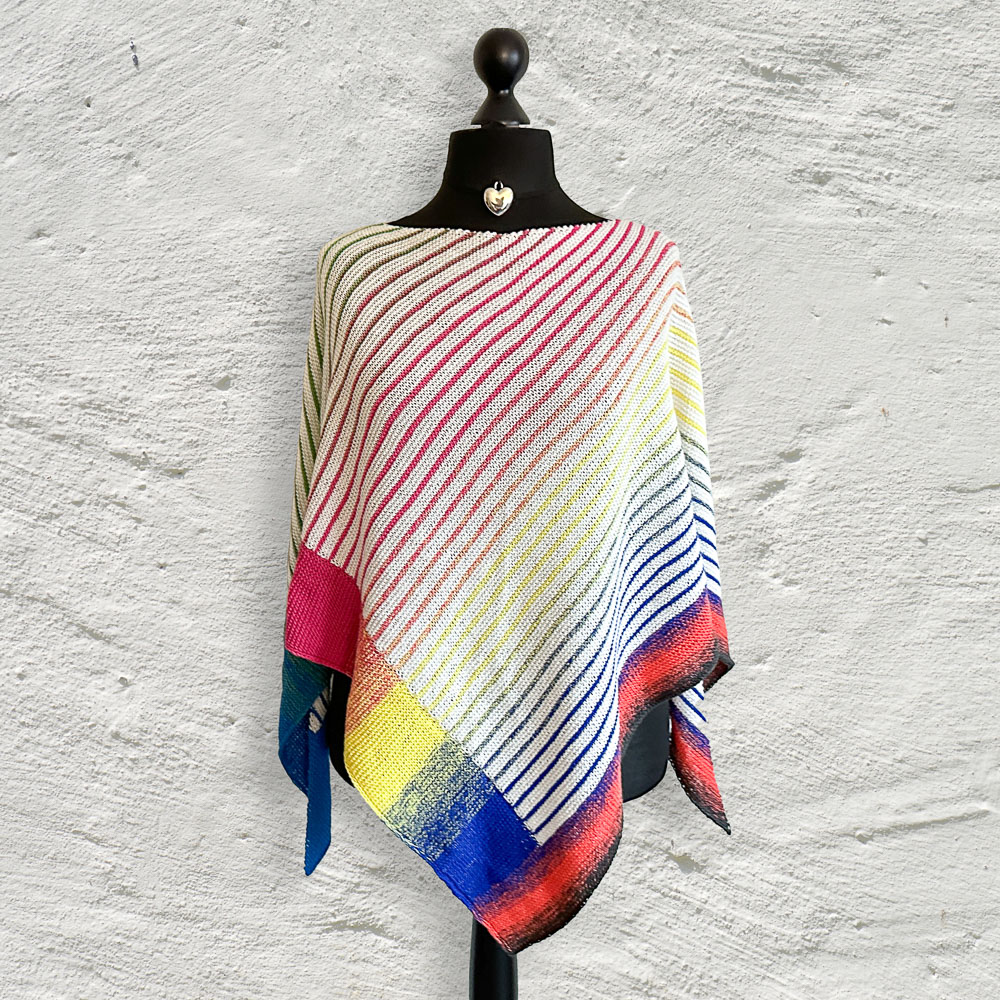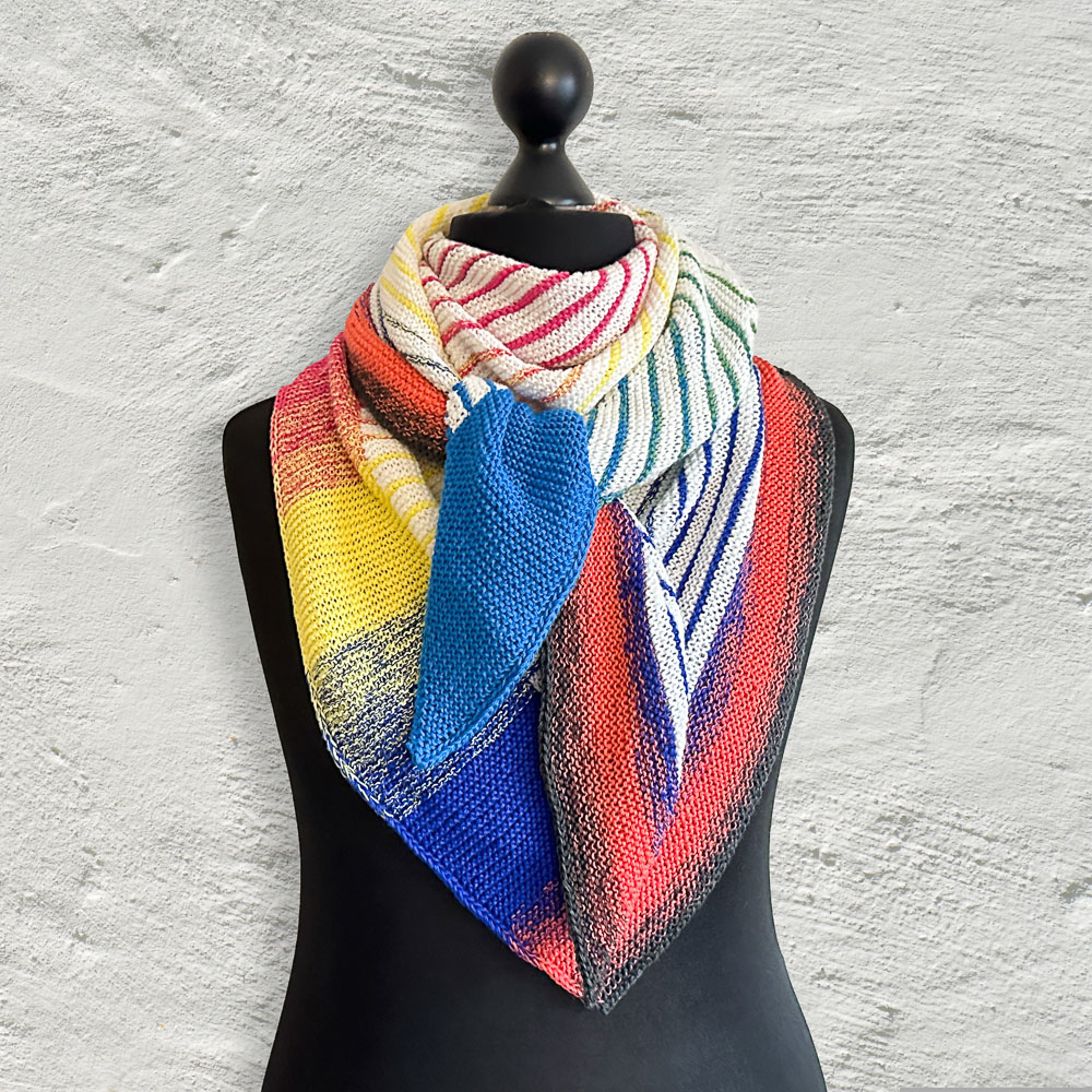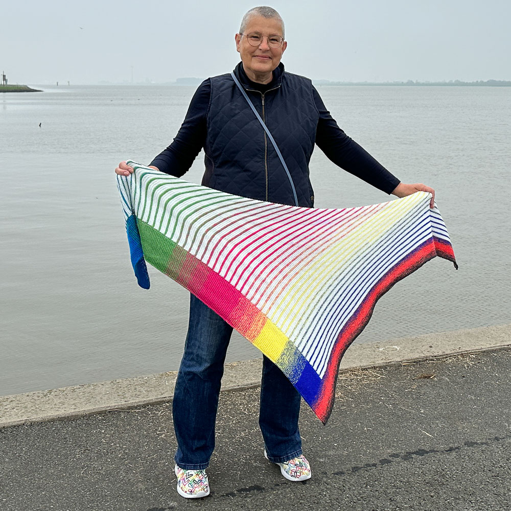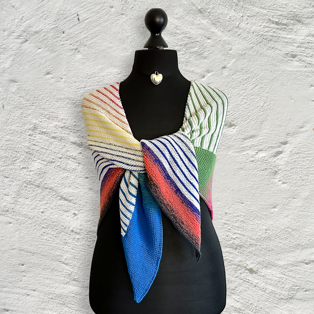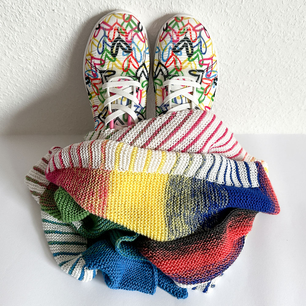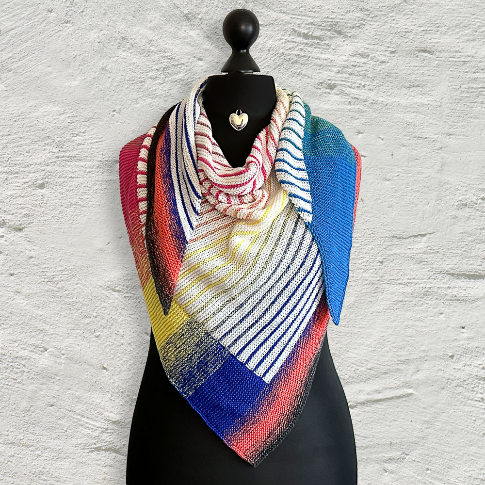 Gestrickt habe ich nach der Anleitung 'Riffkante' von Michaela Schneider, die Ihr in den Dateien der Leuchtturmtuch-Facebook-Gruppe findet. Allerdings habe ich die Bobbel umgedreht: In der Anleitung wird der gerade Teil mit dem Uni-Bobbel gestrickt, die Hauptfarbe des gestreiften Teils ist der Farbverlaufsbobbel. Ich habe den gestreiften Teil mit dem wollweißen Bobbel und den geraden Streifen am rechten Rand mit dem Verlaufsbobbel gestrickt. Diese Idee ist nicht von mir, sondern von Silke Schröter, die so ihr 'Geometrisches Streifentuch' gestrickt hat (auch diese Anleitung findet Ihr in den Dateien der Facebook-Gruppe). Mir gefällt die Verteilung der Bobbel so einfach viel besser.