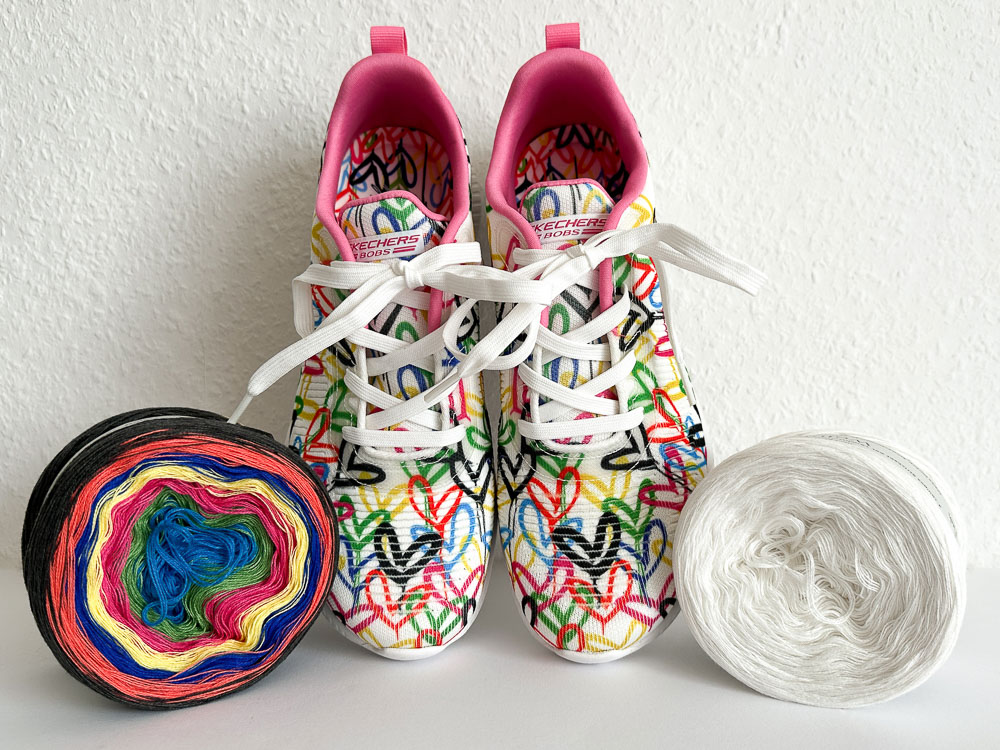Mir war sofort klar, dass diese Schuhe einen passenden Leuchti brauchen, also habe ich mich Zuhause hingesetzt und eine Wunschwicklung gebastelt. Das Rosa der 'Innenausstattung' der Schuhe habe ich weggelassen, weil man das ja nicht wirklich sieht, wenn man die Schuhe anhat. Übrig blieben dann Wollweiß und Herzen in sieben Farben.