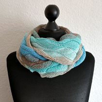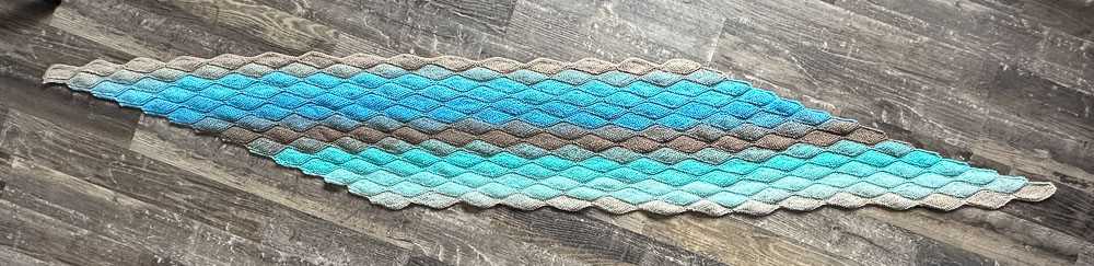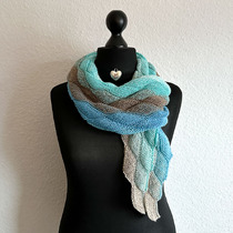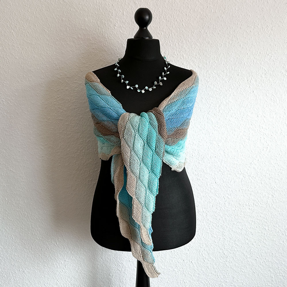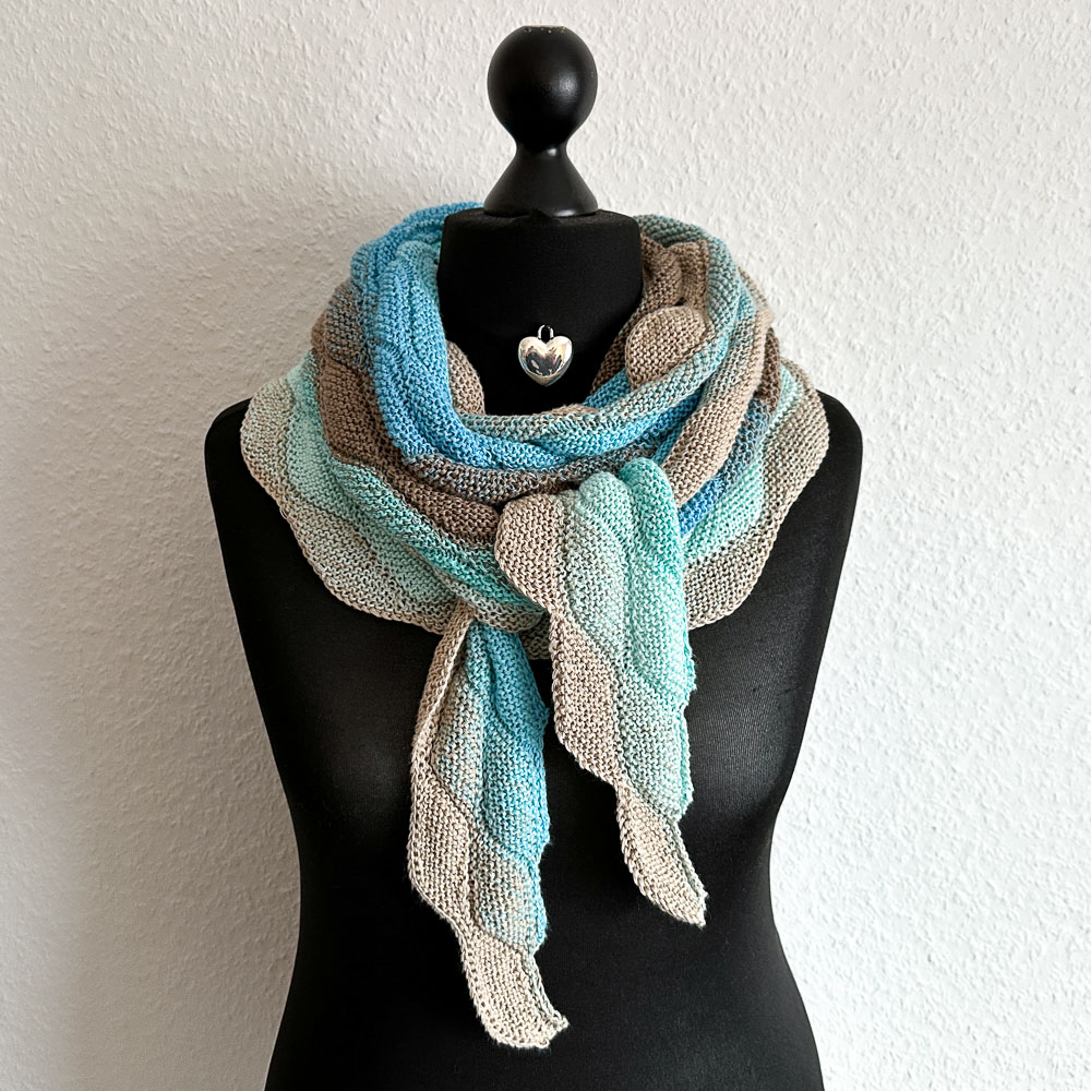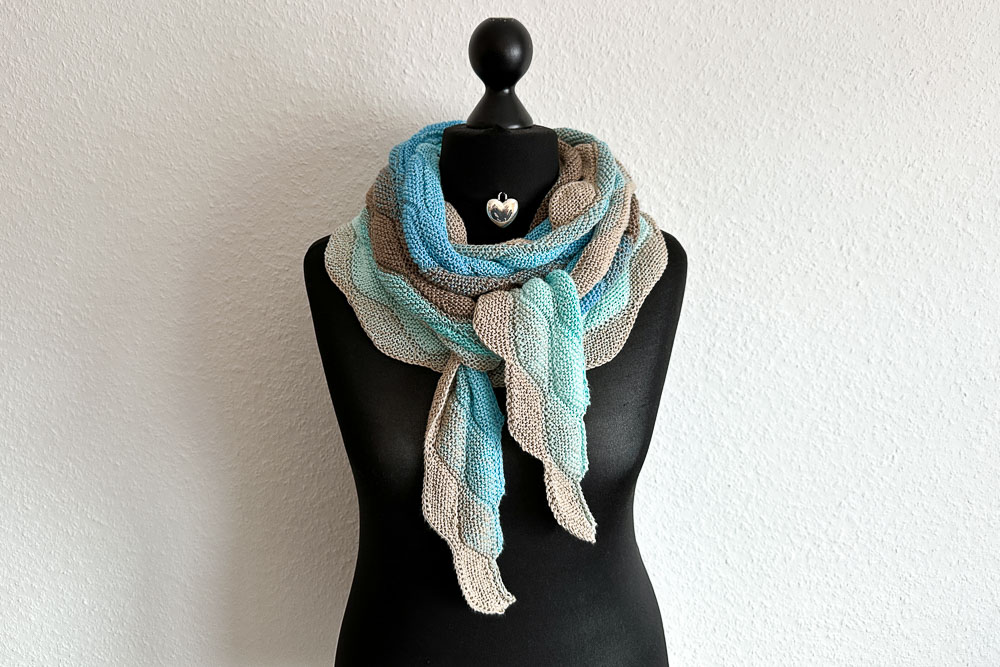 Insgesamt habe ich ca. 260g von knapp 300g verstrickt, also ca. 975 Meter. Gestrickt habe ich mit 3,25er-Nadeln. Das fertige Tuch ist ca. 230cm lang und 40cm breit und gefällt mir ausgesprochen gut.