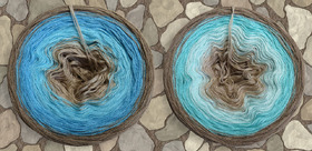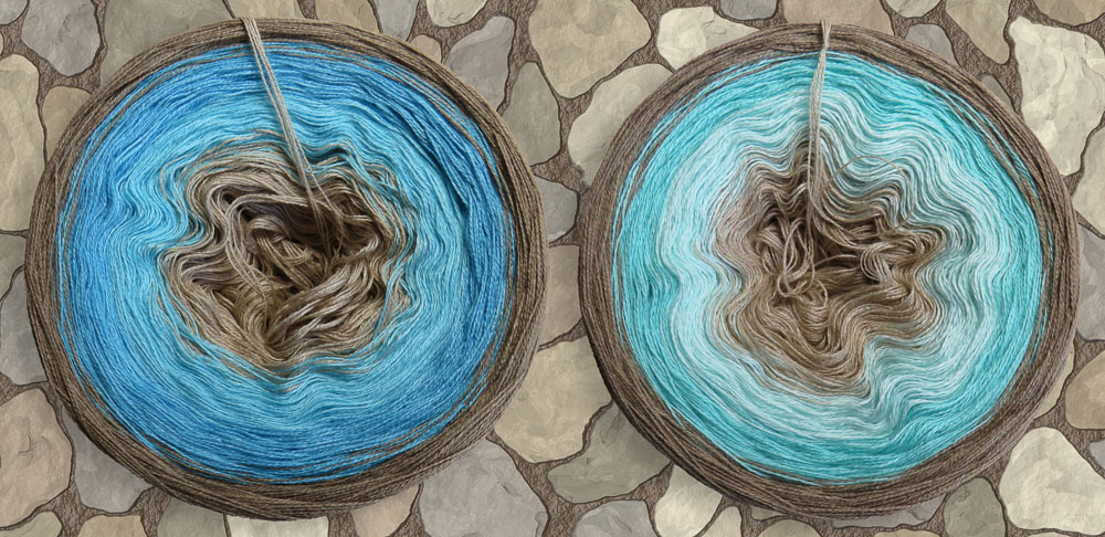 Bei Maike von Meine kleine Wollwerkstatt hatte ich vor einiger Zeit zwei Bobbel aus ihrer Country Living-Serie gekauft, einmal mit Nixe/Capri und einmal mit Pastelltürkis/Nymphe. Im Gegensatz zu dem Foto der Bobbel, das ich Maike verdanke (vielen lieben Dank dafür), weil ich vergessen habe, meine Bobbel zu fotografieren, war der Bobbel mit Pastelltürkis/Nymphe gegenläufig gewickelt, also mit Schlamm in der Mitte und Alabaster außen, weil ich die Bobbel ursprünglich à la Leuchti miteinander verstricken wollte.