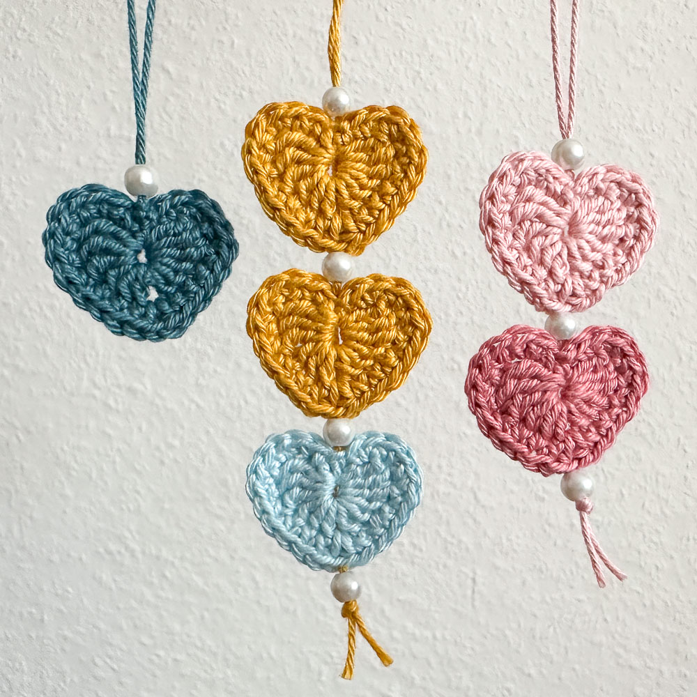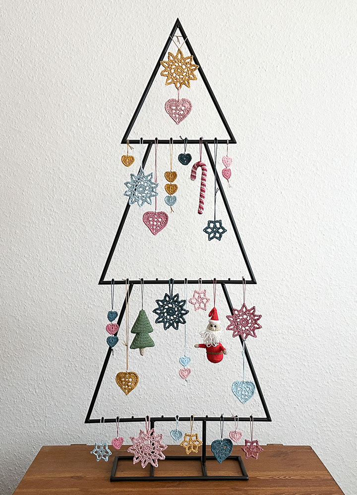 Die kleinen und großen Sterne und die großen Herzen habe ich in den fünf Wunschfarben unserer Schwiegertochter jeweils einmal gehäkelt, die kleinen Herzchen in allen fünf Farben je dreimal. Die Figuren (Zuckerstange, Tannenbaum und Weihnachtsmann) habe ich aus anderen Farben gemacht.
