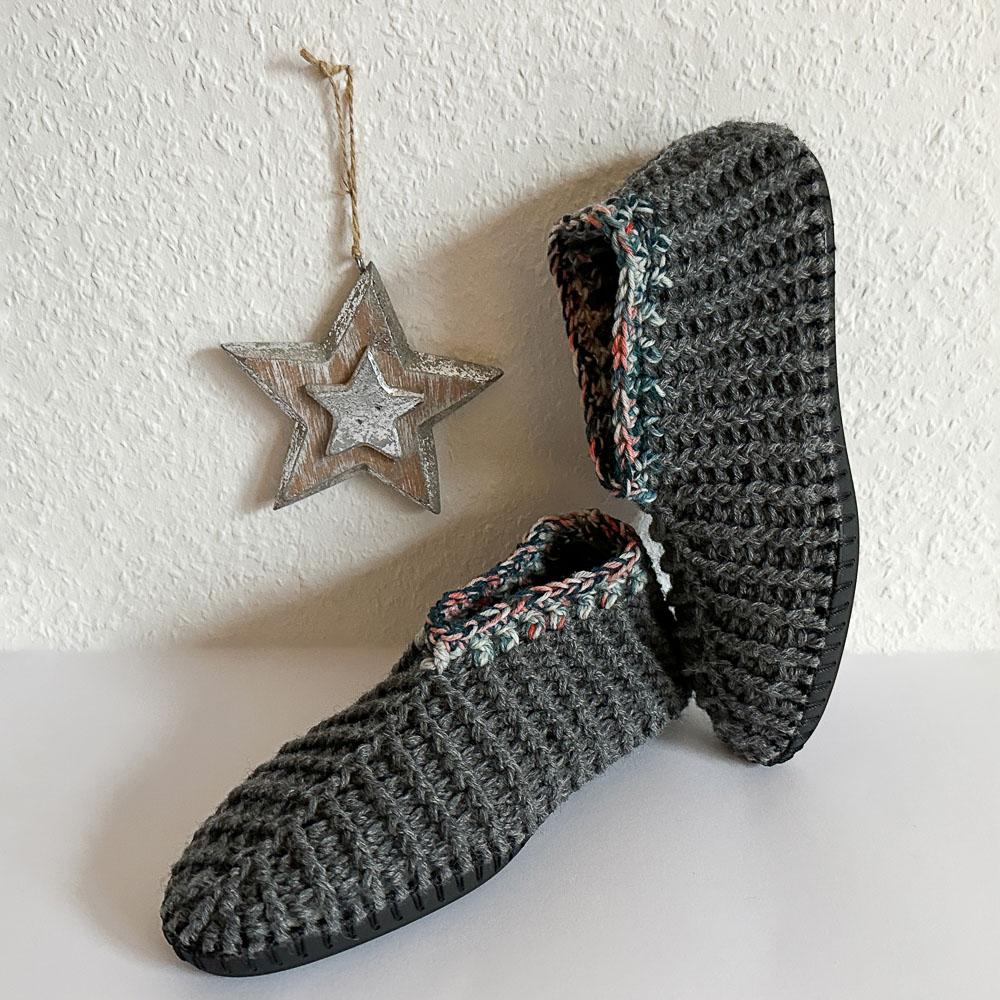 Unsere Schwiegertochter hatte sich gestrickte oder gehäkelte Hausschuhe mit einer festen Sohle gewünscht. Sie hatte welche ohne Sohle, die aber relativ schnell 'durch' waren und hatte gefragt, ob ich ihr neue mit Sohle machen könnte. Ob ich das könnte, da war ich mir nicht so sicher, aber ich wollte es gerne versuchen.
