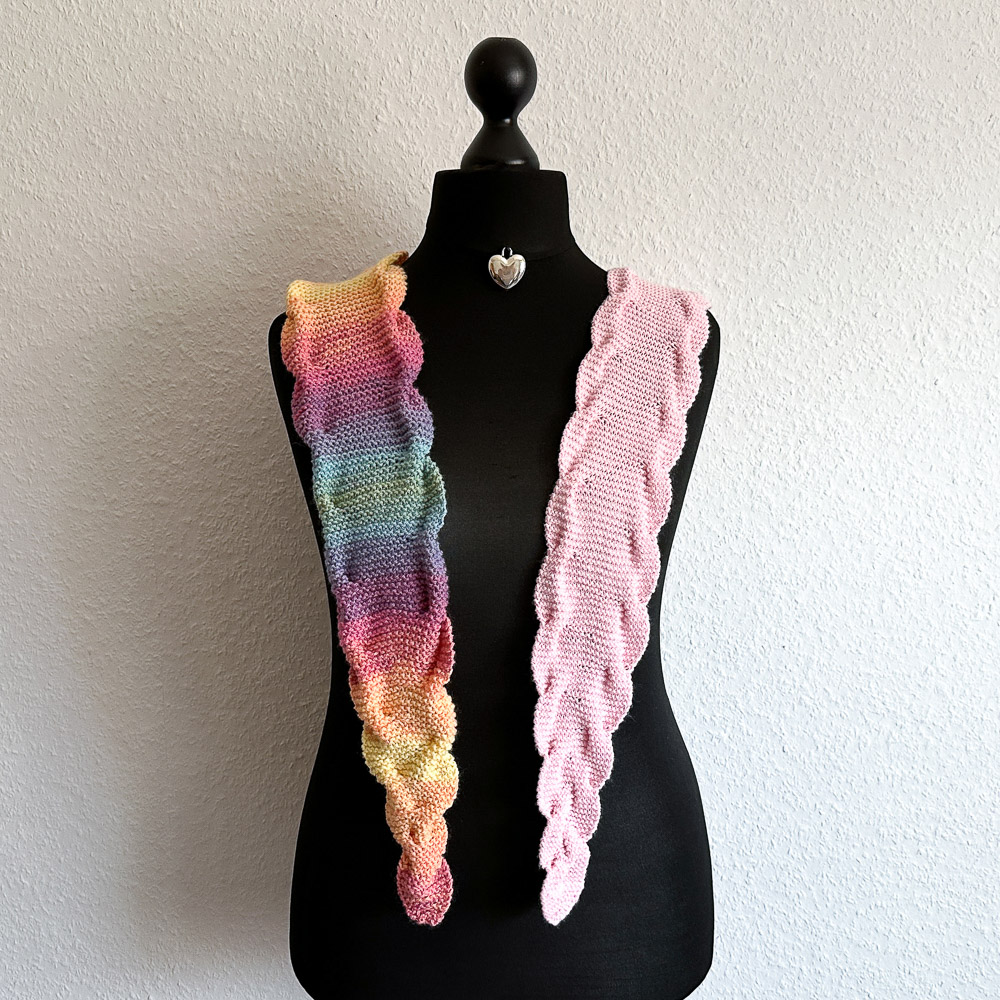 Das rosa Tuch habe ich aus einem Modalgarn (46 % Modal, 40% Polyacryl, 14% Polyamid) von Wollium gestrickt, das bunte Tuch ist aus Brio von DMC (80 % Acryl, 20 % Wolle). Beide Tücher habe ich mit Nadelstärke 4 gestrickt. Das rosa Tuch ist 95 x 9,5cm groß und wiegt etwas über 41g, das bunte hat 100 x 12cm und knapp 43g.