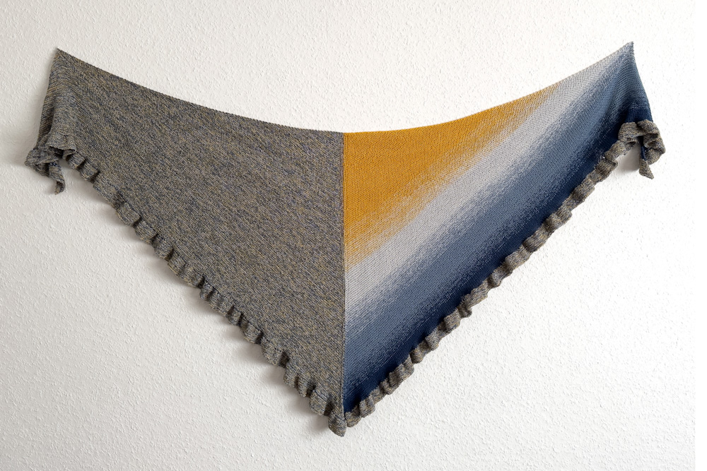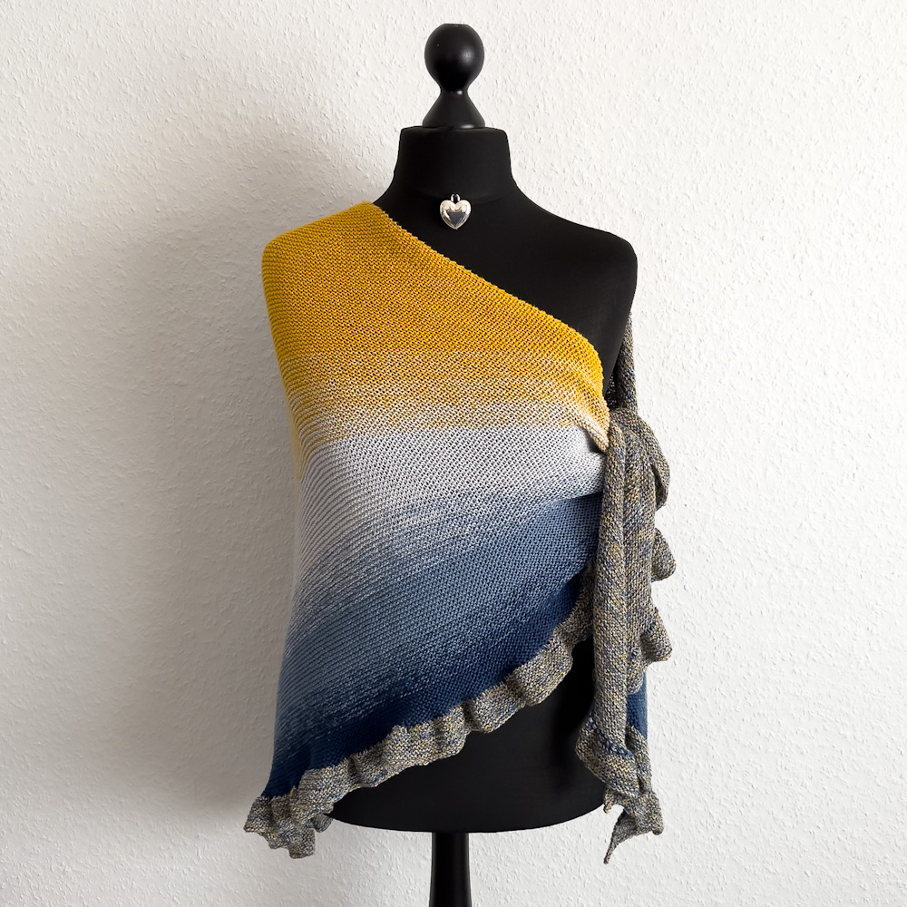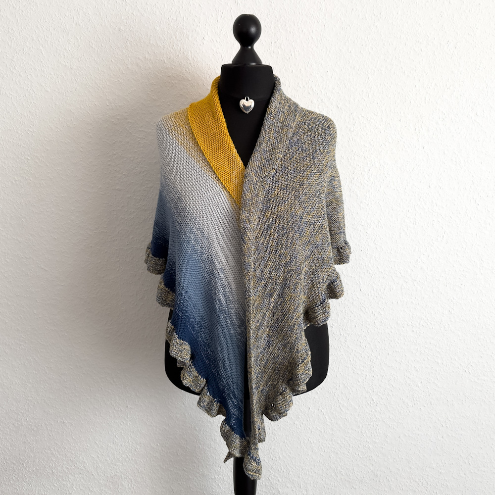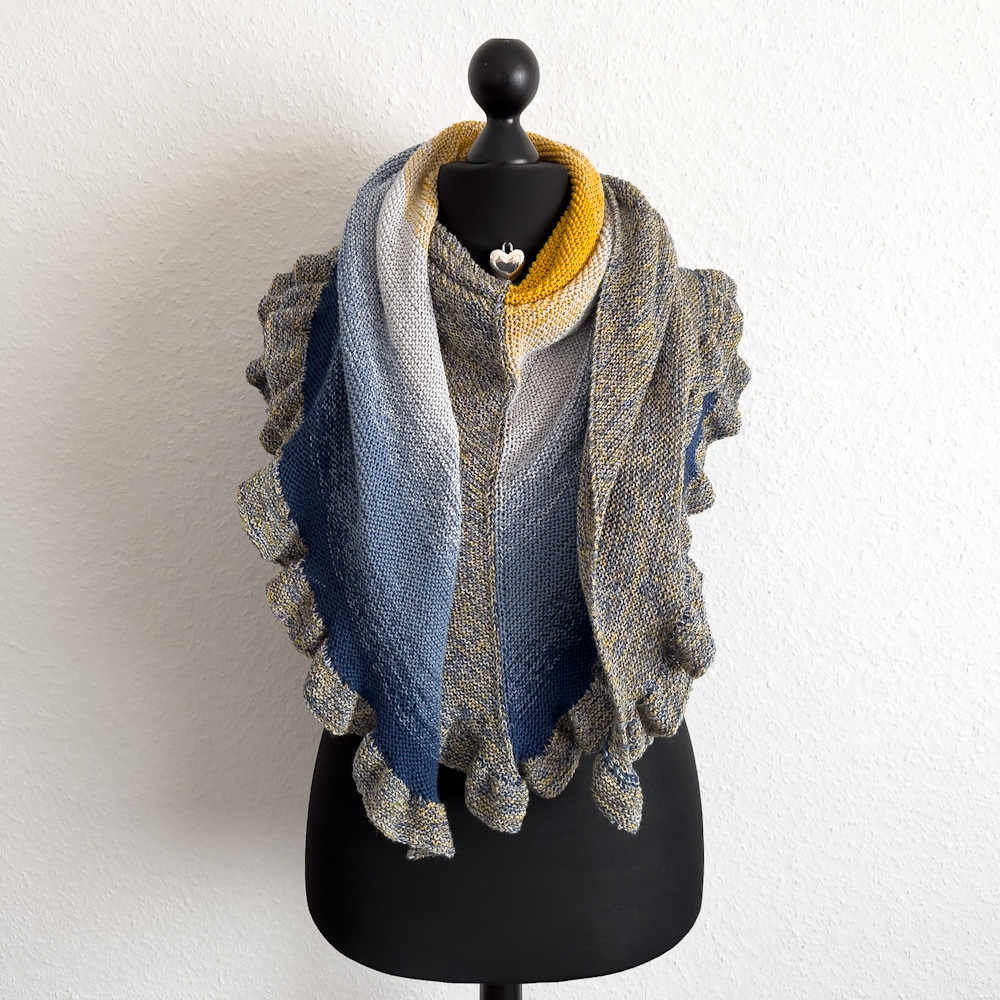 Das Tuch ist 210 x 105cm groß und wiegt 370g; gestrickt habe ich es mit einer 3,5-erNadel nach meiner eigenen Videoanleitung: