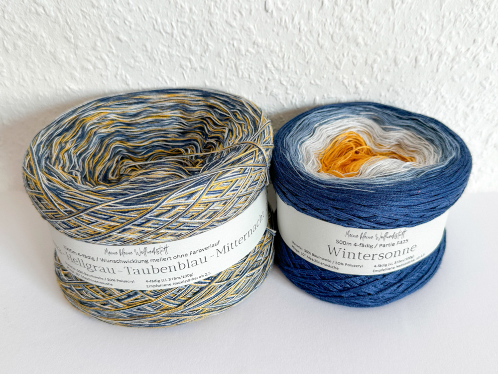 Bei Maike in ihrer Kleinen Wollwerkstatt hatte ich vor einer Weile den wunderschönen Bobbel Wintersonne entdeckt, der es mir sofort angetan hatte. Ich dachte mir, dass er sich als eine Hälfte eines Senkrechtstarters sehr gut machen würde. Als zweite Hälfte habe ich mir einen melierten Bobbel wickeln lassen, dessen vier Fäden genau die Farben der Wintersonne haben.