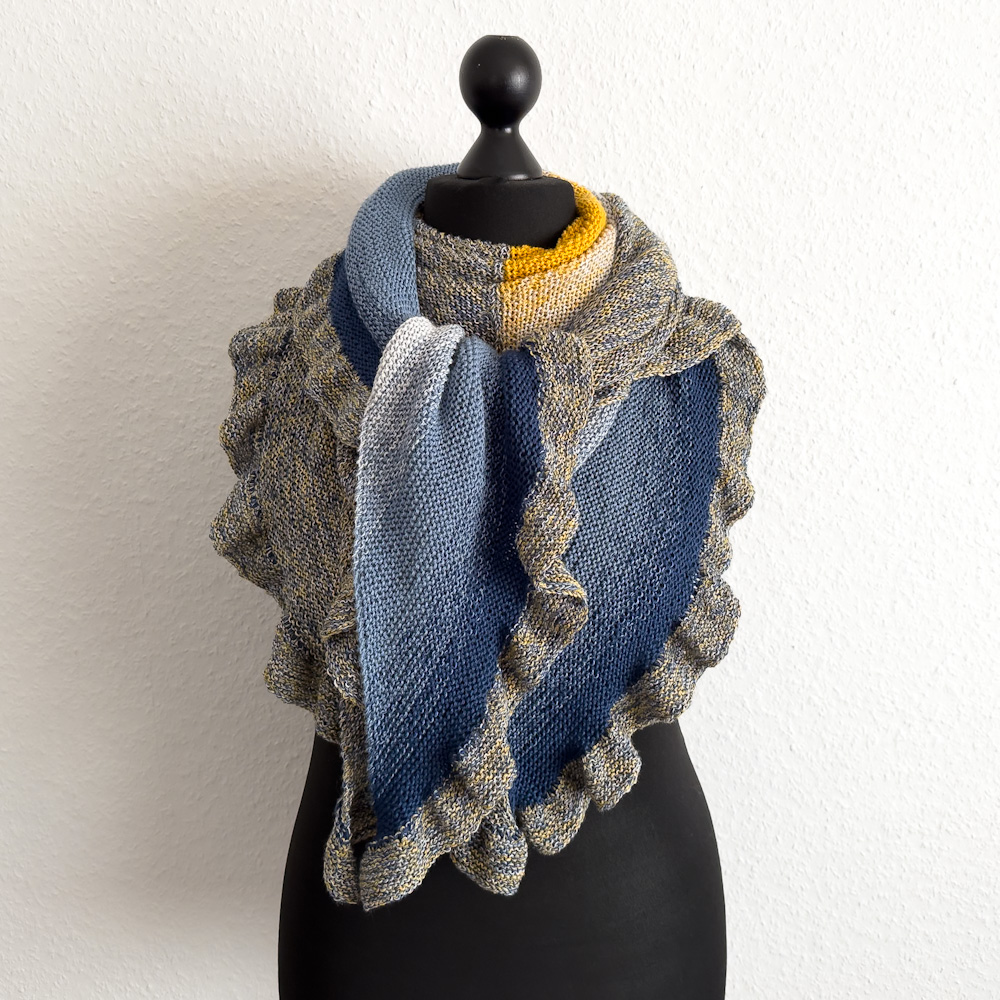 Natürlich muss die Rüsche nicht elastisch abgekettet werden; Ihr solltet aber darauf achten, dass Eure Abkettkante trotzdem nicht zu feste wird, weil die Rüsche sonst ihre Bögen nicht entfalten kann. Da ich sehr feste stricke und meine nicht-elastischen Abkettkanten oft zu eng waren, kette ich sie inzwischen mit einer Nadelstärke mehr ab, das klappt prima. Ich hatte bei diesem Tuch die ganzen Maschen auf einer 3,5er-Nadel und habe zum Abketten eine 4,5er-Nadelspielnadel genommen.