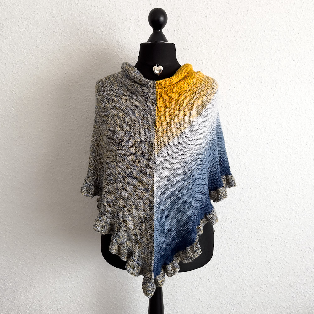 Gestrickt habe ich mit einem vierfädigen 500m-Bobbel Wintersonne (das war eine Sonderwicklung; normalerweise hat der Bobbel 550g) und dazu einem 1.000m-Bobbel in meliert. Verbraucht habe ich den 500m-Bobbel komplett, von dem melierten Bobbel sind ca. 35g/130m übrig.