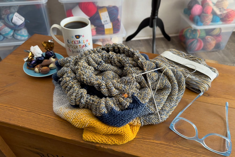 Durch die Verdoppelung der Maschen und die zusätzlichen Zunahmen in der zweiten Hinreihe bekommt Ihr einen Haufen Maschen auf die Nadel und das Stricken ist ein bisschen unbequem. Ich bin auf eine 120cm lange Rundnadel gewechselt, obwohl ich eigentlich alles über 80cm gar nicht mag, aber hier ging es einfach nicht anders.