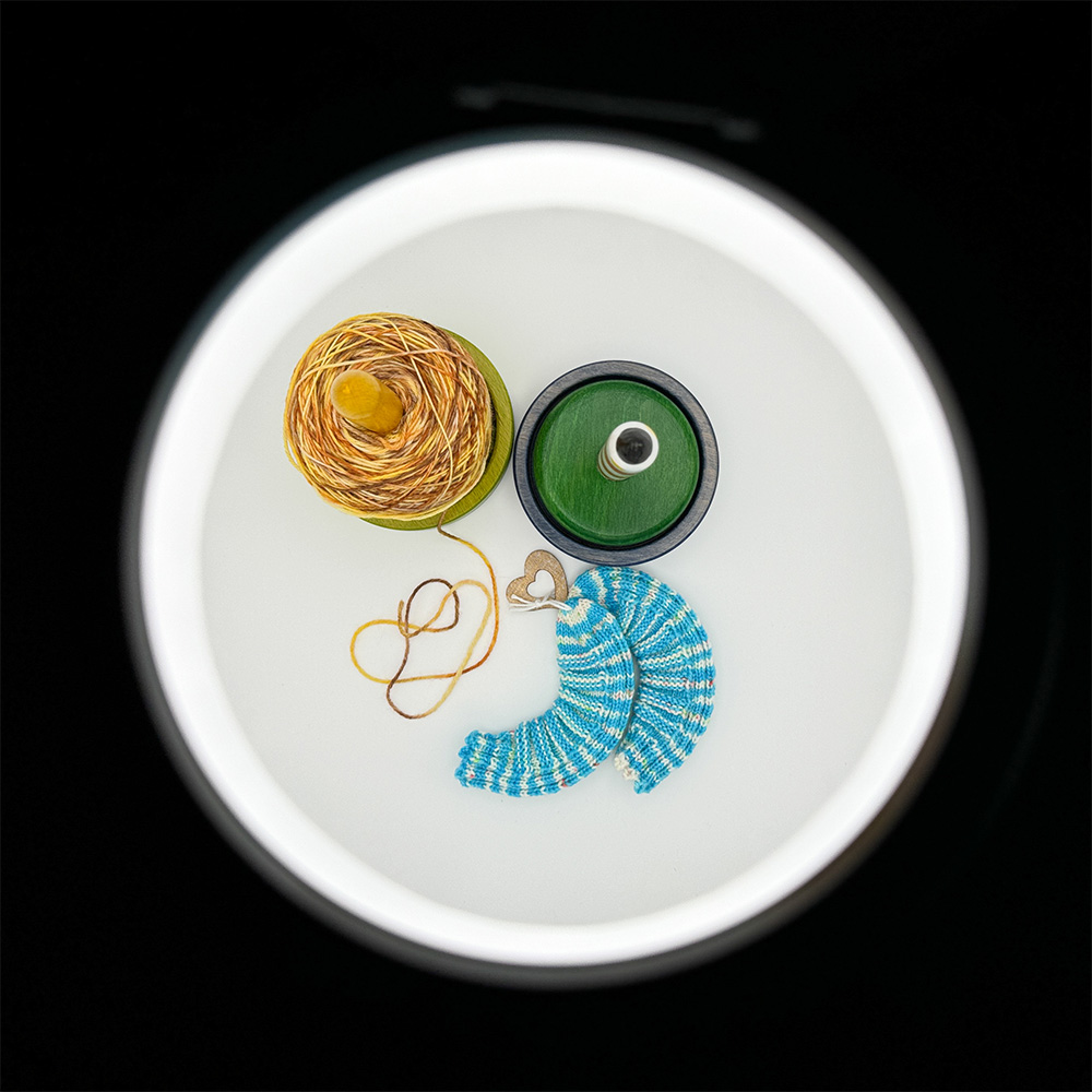 Kleinere Dinge wie Socken oder Wollknäule habe ich bisher immer auf ein weißes Brett auf eine meiner Wollkisten vor die weiße Wand gelegt, was allerdings nicht wirklich gut war. Es gab auch hier immer starke Schattenbildung und ich musste die Bilder oft sehr aufwändig nachbearbeiten, damit die Belichtung etwas gleichmäßiger aussah.