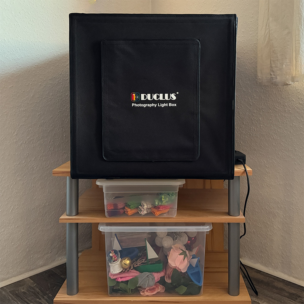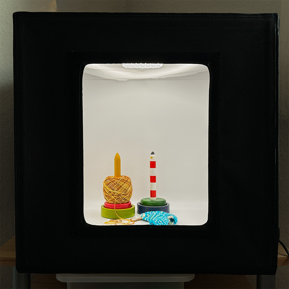 Ich habe eine 50 x 50 x 50cm-Box bekommen; es gibt sie in verschiedenen Größen. Da ich sie auch für die Tutorial-Videos brauche, müssen meine Hände samt Strickzeug reinpassen; weniger als die 50er-Größe wäre deshalb zu klein gewesen und mehr zu unhandlich. Da sie lichtdicht ist, also kein Licht von außen eindringt (außer natürlich an den Öffnungen, durch die man fotografiert), ist es relativ egal, wo sie steht. Meine steht im Wohnzimmer in der Ecke zwischen weißer Wand und Fenster.