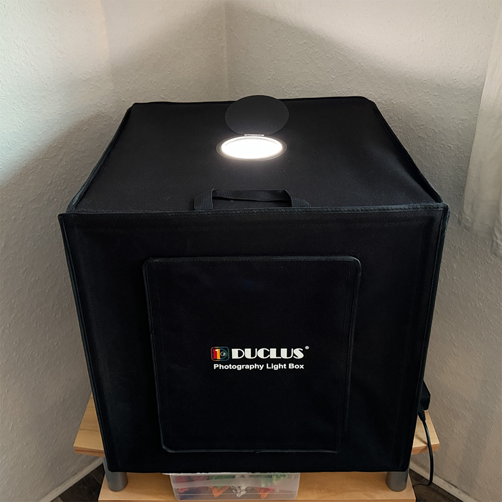 In die Box kann man alles mögliche reinlegen und es fast schattenfrei fotografieren; entweder von vorne oder von oben. Dazu kann man den Kasten vorne ein bisschen oder ganz öffnen oder oben eine Art Luke aufklappen.
