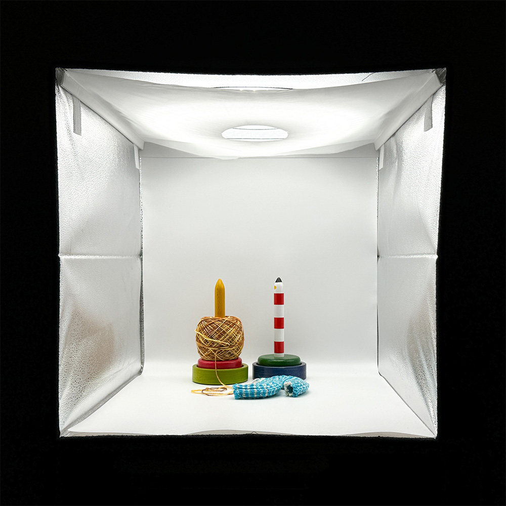 Nach meinem letzten Video-Tutorial hat mein Bartträger beschlossen, dass ich eine Fotobox brauche. Das ist eine Art Kiste, die lichtdicht, aber innen beleuchtet ist. Die inneren Wände sind mit einer silbernen, nicht glatten Folie ausgekleidet, so dass das Licht reflektiert wird, und man kann verschiedenfarbige Hintergründe einsetzen (ich benutze allerdings nur den weißen). Die Beleuchtung ist oben und darunter hängt ein dünnes Diffusor-Tuch aus weißem Nylon oder Seide, dass das Licht zerstreut und weich macht und so dafür sorgt, dass es so gut wie keine Schatten gibt.