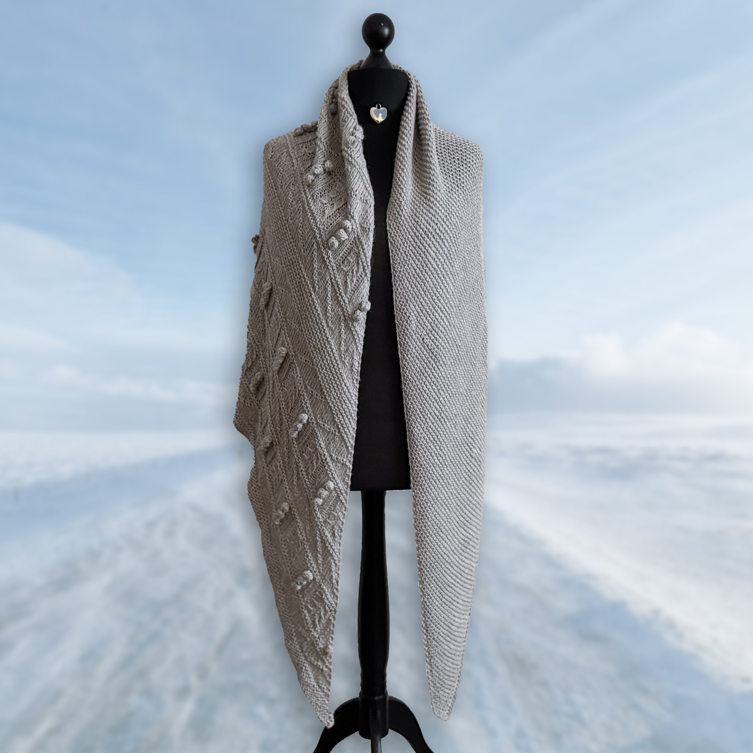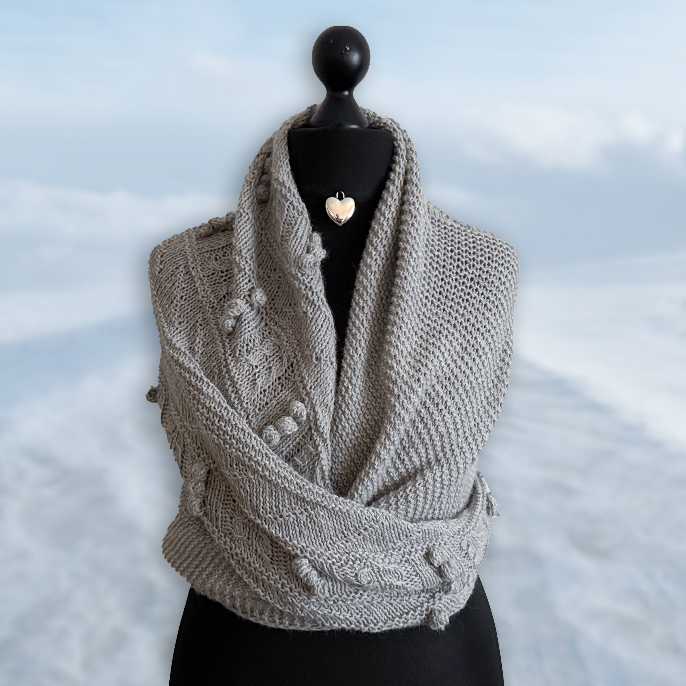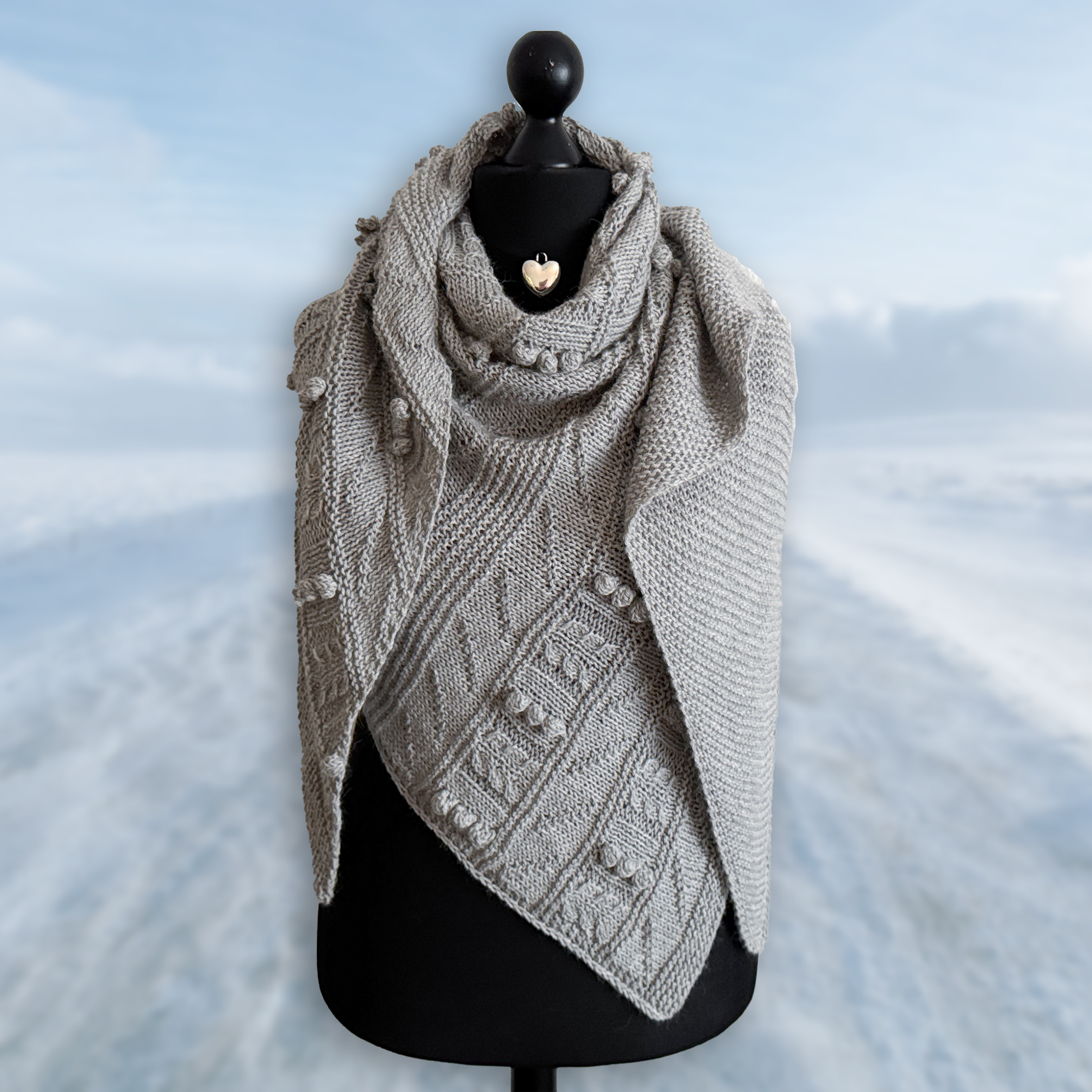 Gestrickt habe ich mit Nadelstärke 5,5; verbraucht habe ich 448g. Das fertige Tuch hat 245 x 185 x 150cm Kantenlänge. Das ist deutlich größer als in der Anleitung angegeben, aber ich habe durch die 5,5er-Nadeln auch bewusst ziemlich locker gestrickt.