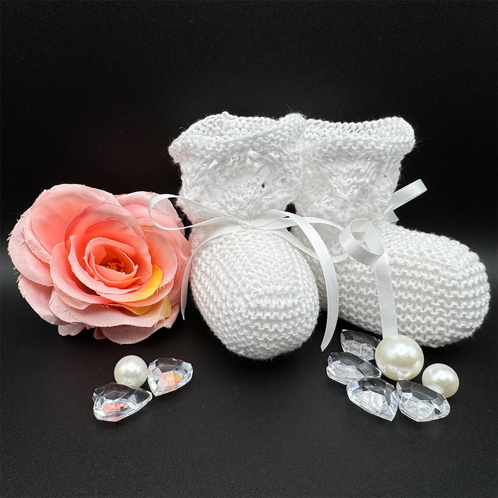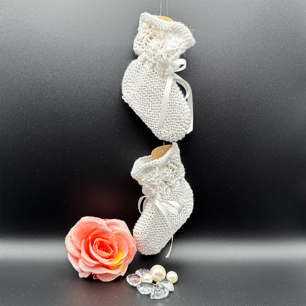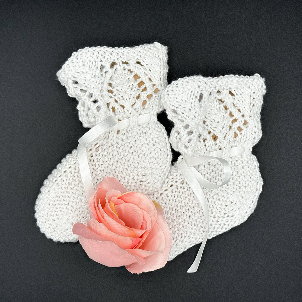 Meine Freundin Christa hat mich gefragt, ob ich wohl für ein kleines Mädchen für ihre Taufe ein paar weiße Schühchen stricken könnte. Das Taufkleid hat sie mir per Foto gezeigt; es hat ein zartes Ajour-Muster am Saum und an den Ärmeln. Also wollte ich ein Paar Schühchen stricken, das auch einen Spitzenrand hat.