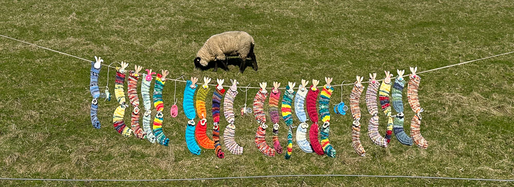Vor knapp zwei Wochen hatte ich Euch hier von meinem Großauftrag 'Bananensocken für Säuglinge' erzählt und dem Grund dafür. Inzwischen habe ich die Paare 11 bis 30 fertig und das herrliche Wetter heute genutzt, um ein Sockengruppenfoto draußen zu machen - stilecht mit Schafen im Hintergrund. Drinnen habe ich dann die Socken noch fünfpaarweise abgelichtet.