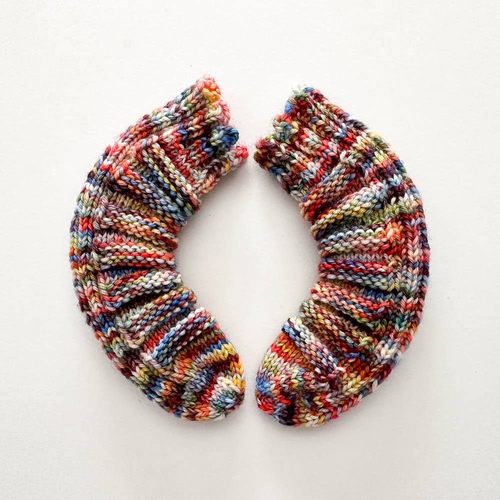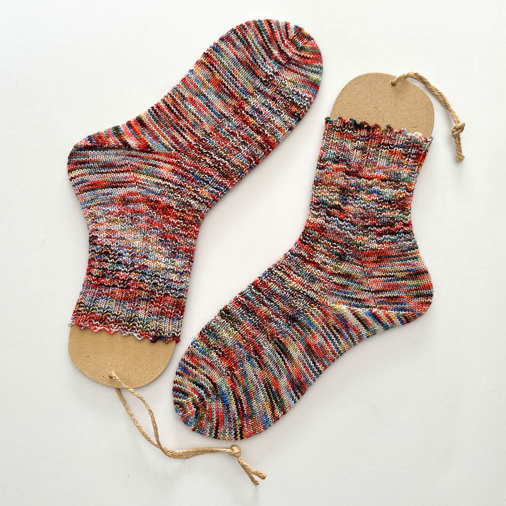 Aus einem Strang von Nicoles wunderbar weicher und unglaublich gut duftender, von ihr handgefärbter Merino-Sockenwolle sind zwei Paar Socken geworden: Eins in Säuglingsgröße und eins in 42/43. Ihr findet Nicoles handgefärbte Schätze hier in ihrer Facebook-Gruppe.