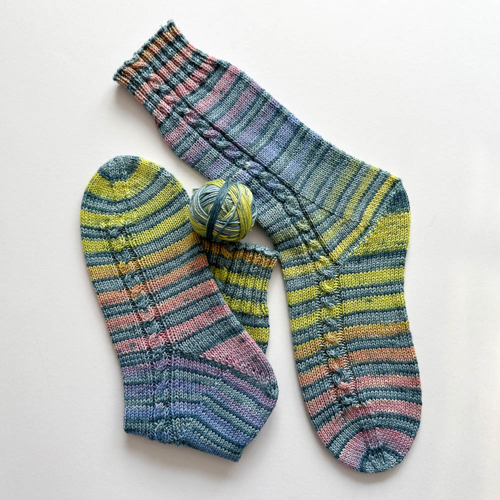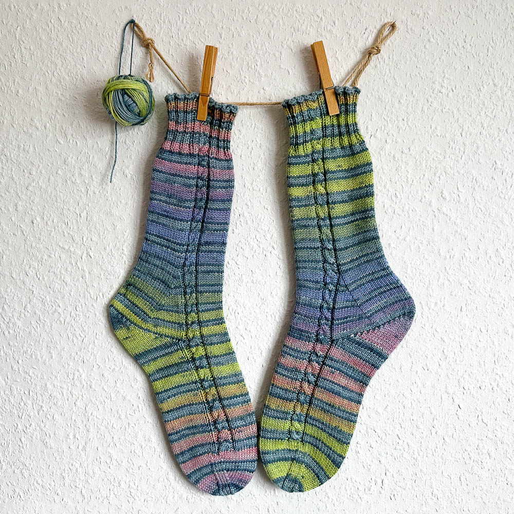 Gestrickt habe ich daraus ein paar Socken in Größe 40. Da die Wolle fröhlich streift, habe ich auf ein aufwändiges Muster verzichtet und nur links und rechts auf dem Fuß einen vier Maschen breiten Zopf eingestrickt, der schon oben im Bündchen beginnt.