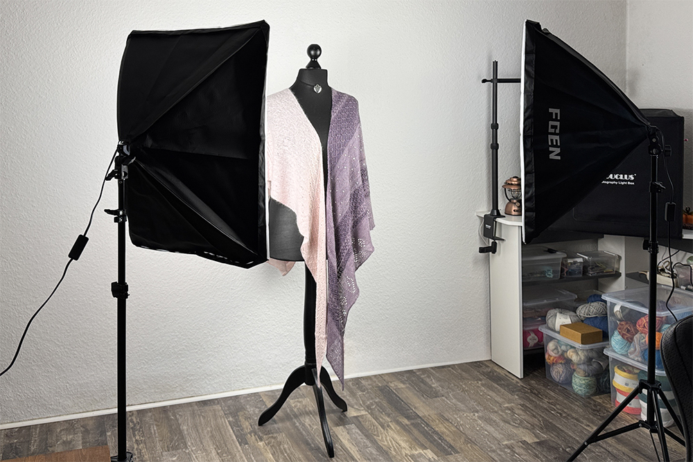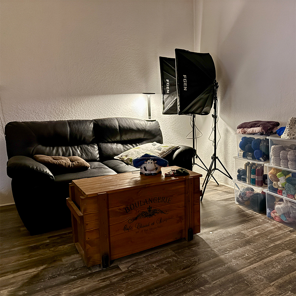 Aha, also Softbox-Scheinwerfer. Das sind Scheinwerfer, die einen Diffusor haben und ganz weiches Licht machen. Geträumt hatte ich immer wieder mal von sowas - lange überreden musste er mich also nicht. Das Problem: Die weiße Wand, vor der ich meine Tücher mit Luises Hilfe fotografiere, ist im Wohnzimmer. Das hat keine 16qm, aber dort sind (außer Luise) auch all meine Wollvoräte, meine Lichtbox, unser Riesenschreibtisch samt zwei Schreibtischsesseln, ein kleines Sofa und eine alte Kiste als Couchtisch. Sehr viel Platz für große Scheinwerfer ist da nicht wirklich. Zwischen unserem Schreibtisch und der Fotowand sind es ca. 2,80m. Luise steht vor der Wand und weiter zurück als bis zum Schreibtisch kann ich nicht. Irgendwo dazwischen mussten die Scheinwerfer hin, zumindest im Einsatz.