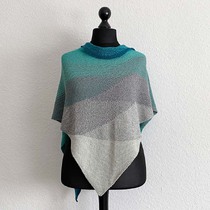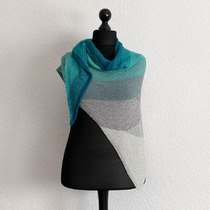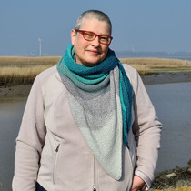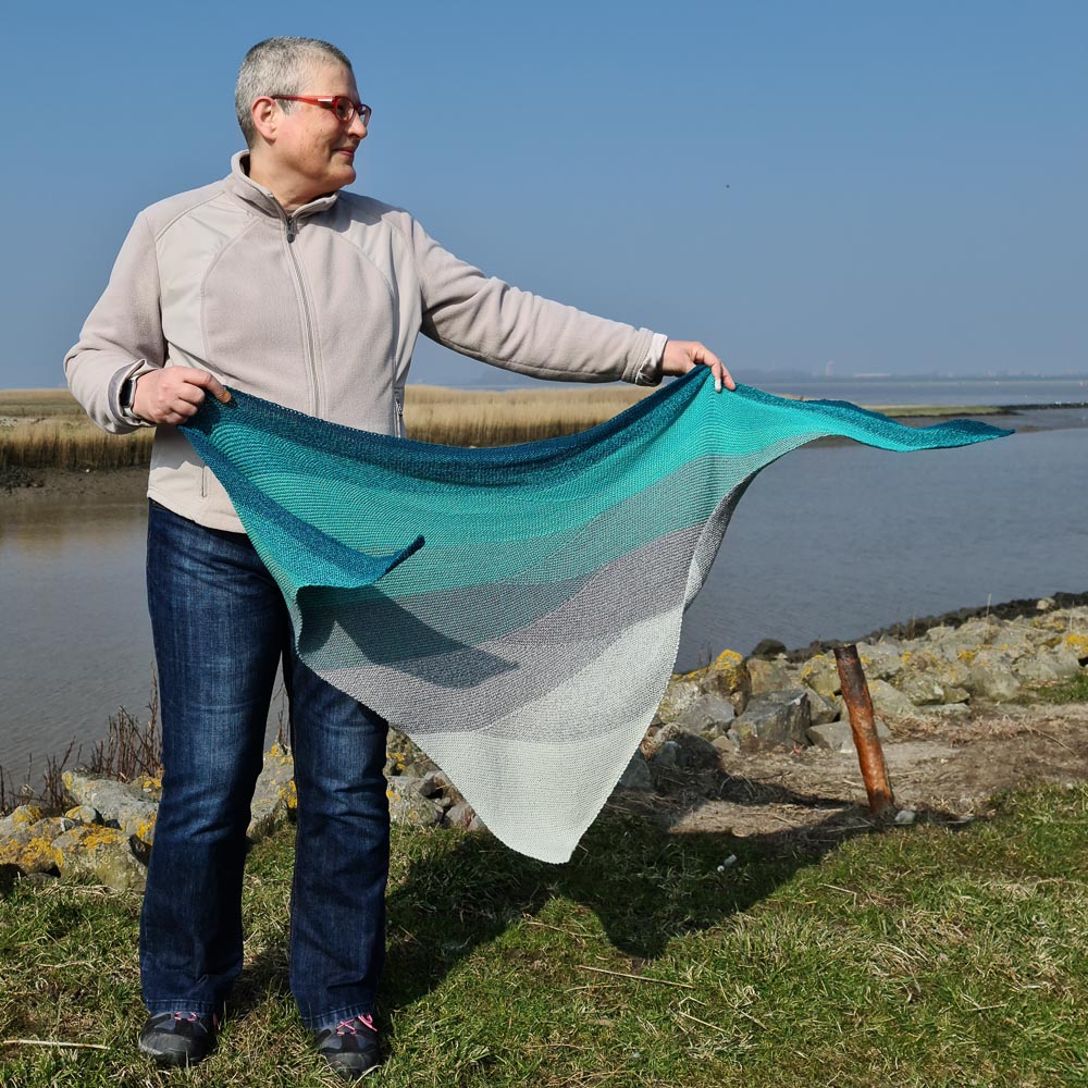 Dieses Tuch, dessen Name mein Mann erfunden hat, habe ich im Grunde als Versuch gestartet. Es gibt Wolle, die speziell für diese 'Keile', die man mittels verkürzter Reihen strickt, gemacht ist, aber ich dachte mir, dass das doch auch mit normaler Farbverlaufswolle gehen müsste - und es geht tatsächlich. Zwischendurch hatte ich zwar mal den Eindruck, dass das Tuch nicht wirklich tragbar sein wird, weil es zu lang, aber oben an der Halskante zu schmal sein wird, aber jetzt im fertigen Zustand gefällt es mir ausgesprochen gut.