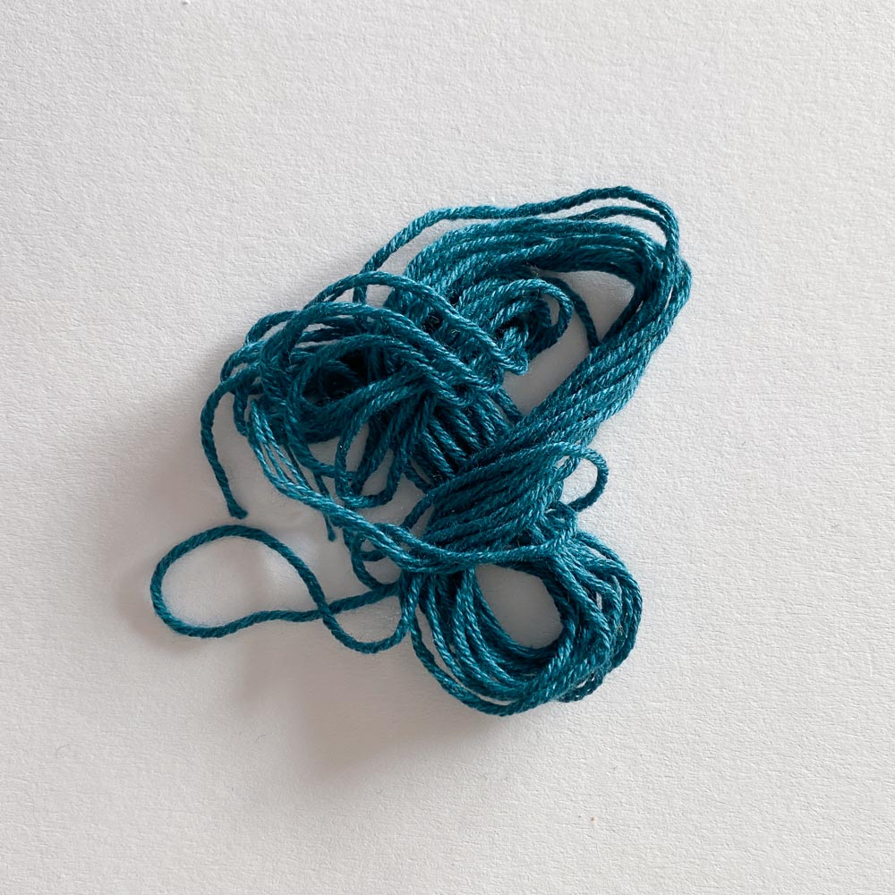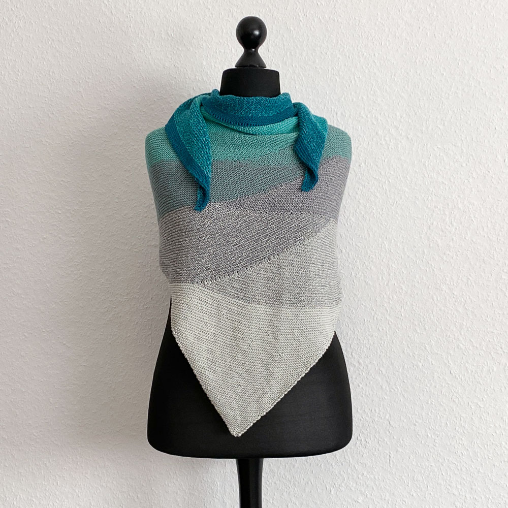 Gestrickt habe ich nach der Anleitung für das 1-2-3-Tuch von Sylvie Rasch; die Anleitung findet Ihr hier. Verstrickt habe ich mit Nadeln in 3,5 einen meiner Lieblingsbobbel, nämlich einen Bobbel Twister von Hobbii in der Farbe Raindrops (46); am Ende hatte ich 363 Maschen auf der Nadel. Übrig hatte ich nach dem Abketten genau 0,78 Gramm der Wolle; das hat wirklich wunderbar gepasst, wobei ich anmerken muss, dass ich zum Abketten (anders als Sylvie Rasch es in ihrer Anleitung angibt) die zweieinhalbfache Garnmenge einer normal gestrickten Reihe gebraucht habe. Ich habe allerdings auch extra locker abgekettet, damit die Halskante auf gar keinen Fall spannt.